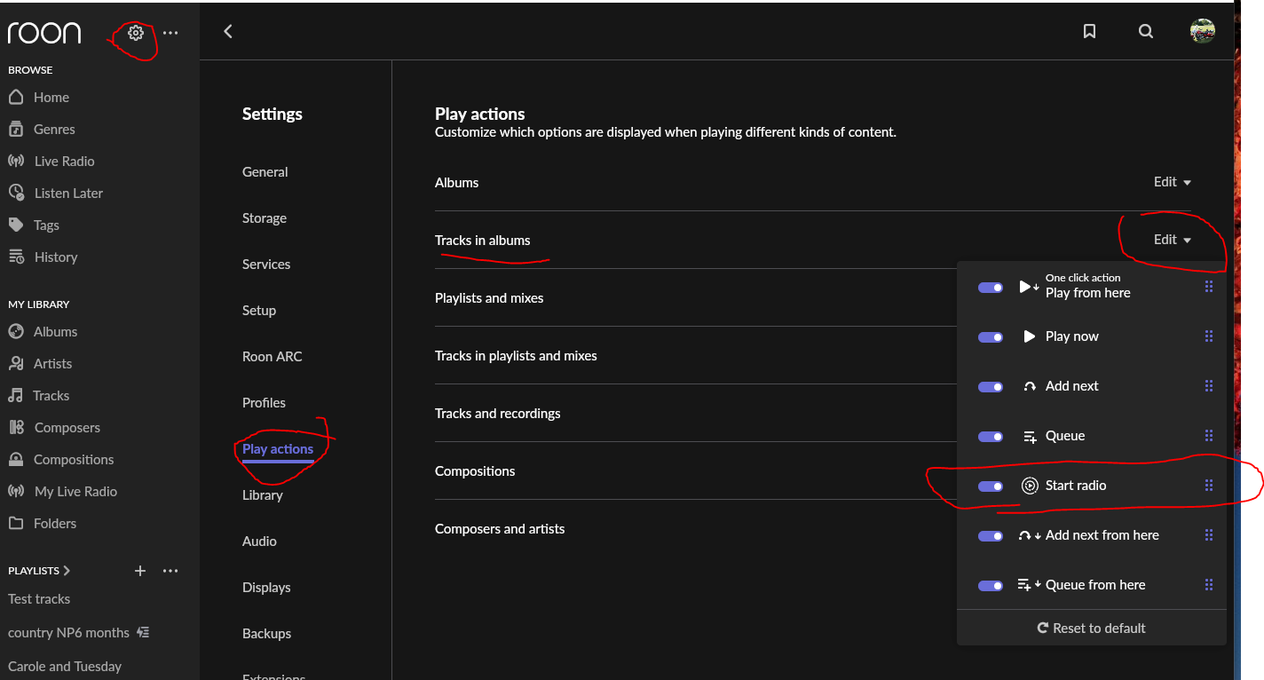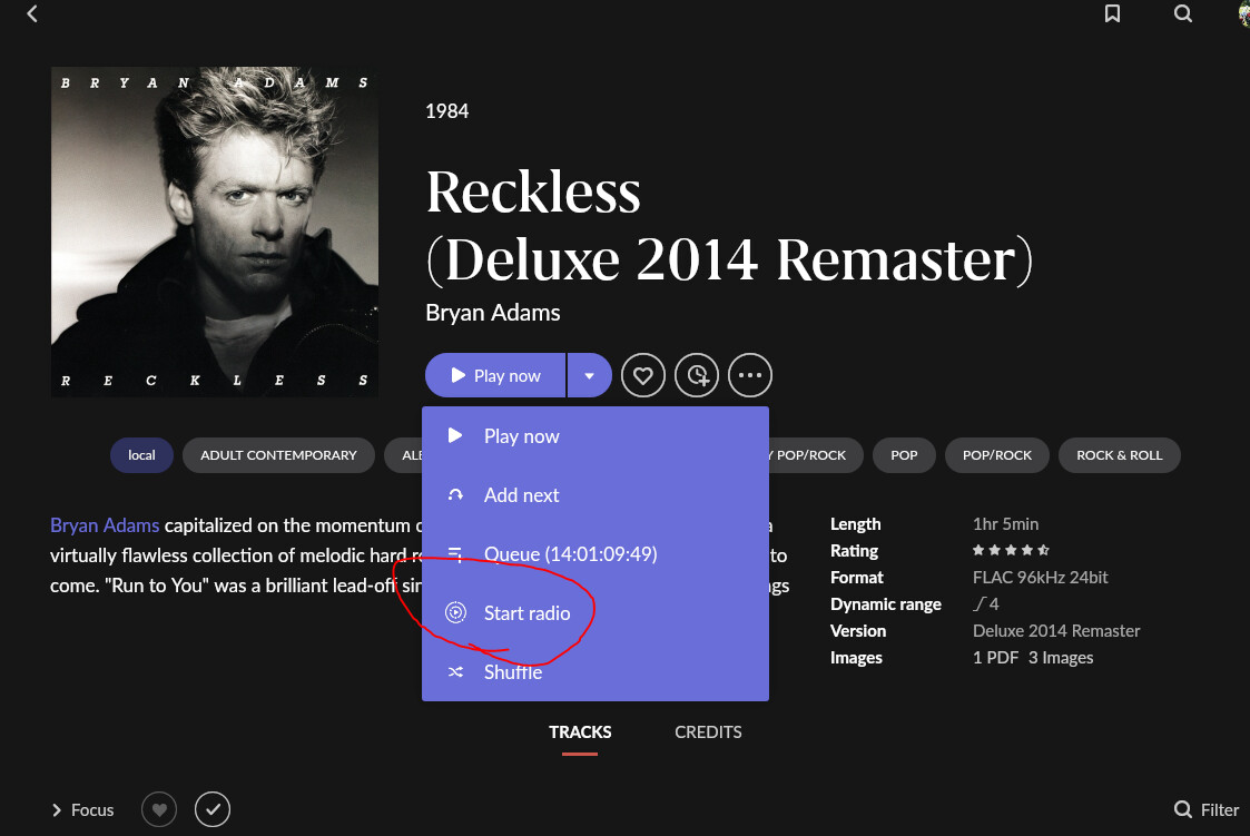 Edit2: You can start the radio from the album page (make sure “start radio” is enabled in settings paly actions for album, like I describe below for tracks).