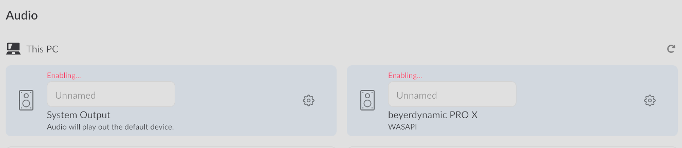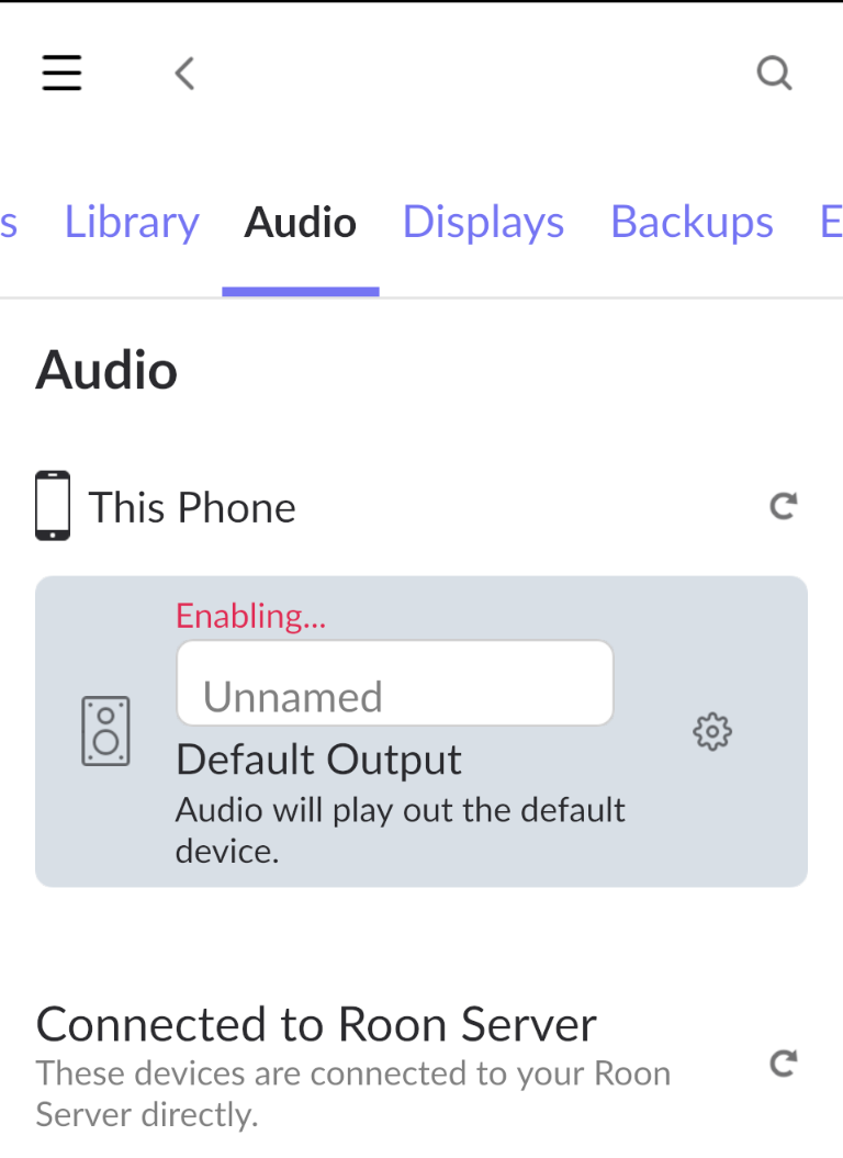 The Roon phone app shows “Default Output” is “Enabling…” but it doesn’t complete the activity. As a result, the phone is no longer listed as an available Roon audio device.