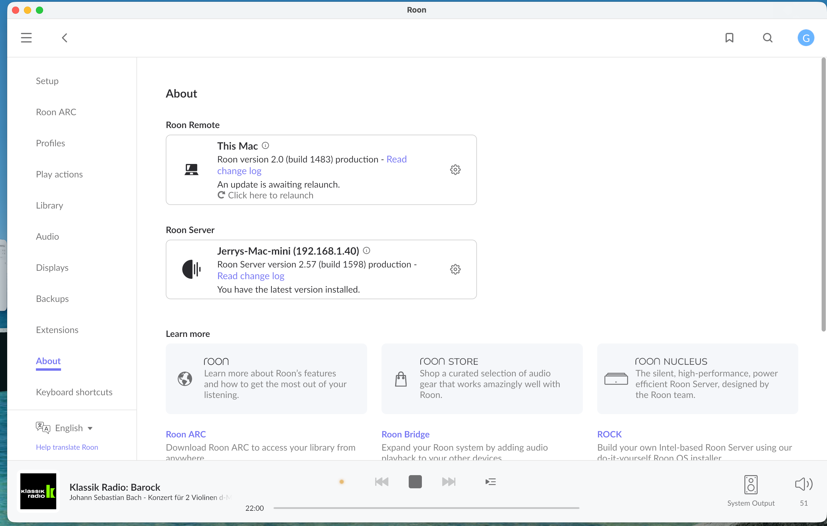· Roon Remote on MacBook Pro (Apple OS 26.2) won't update. Roon Remote current version is 2.0 (1483). My Roon Server running on a Mac mini M4 (Mac OS Sequoia) is up to date 2.57 (1598), but every time I acknowledge that Remote on the MacBook is not up to date and initiate the update process it seemingly executes and ends up prompting that it is needs updating. Music and Live Radio play ok.