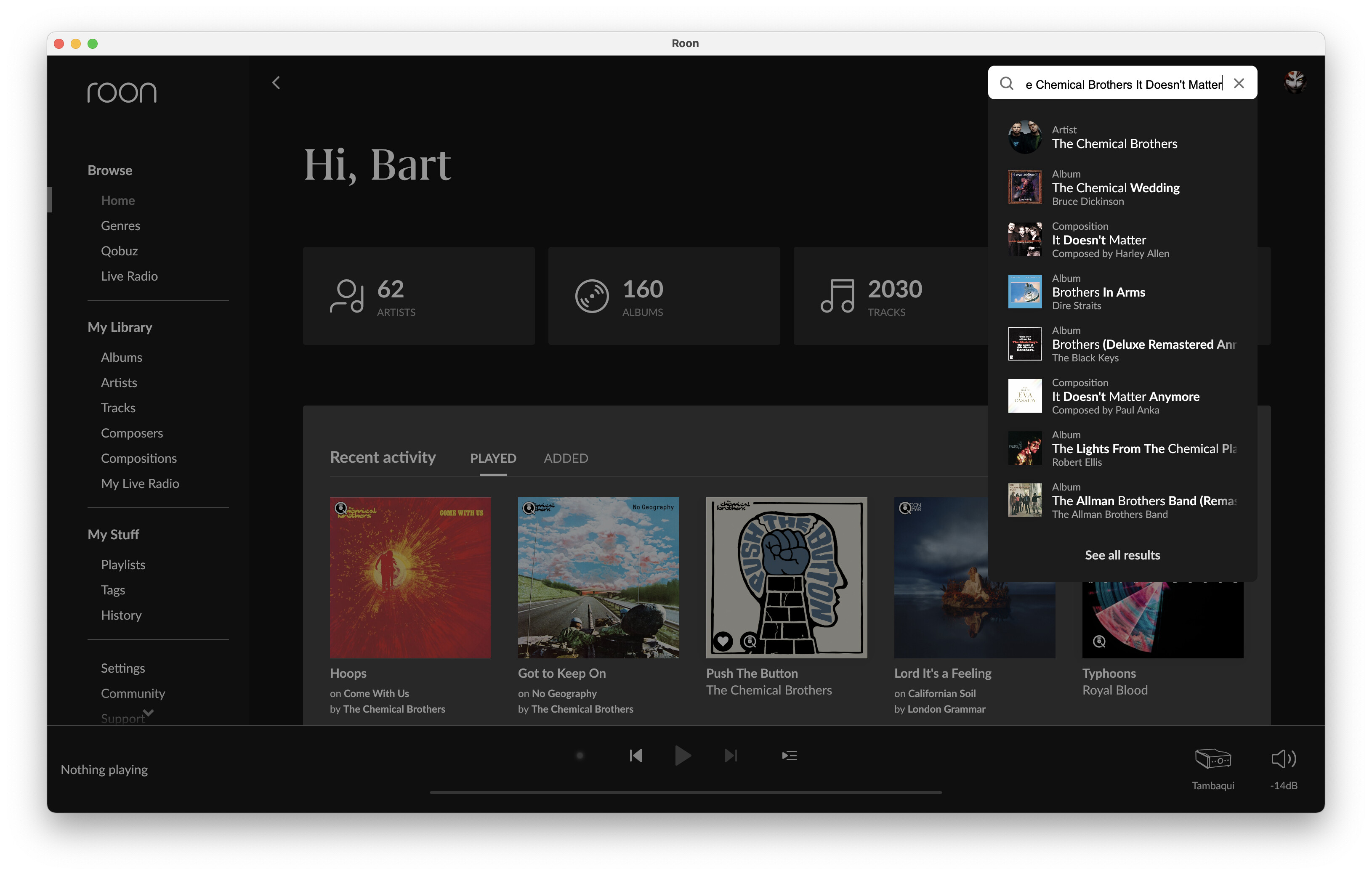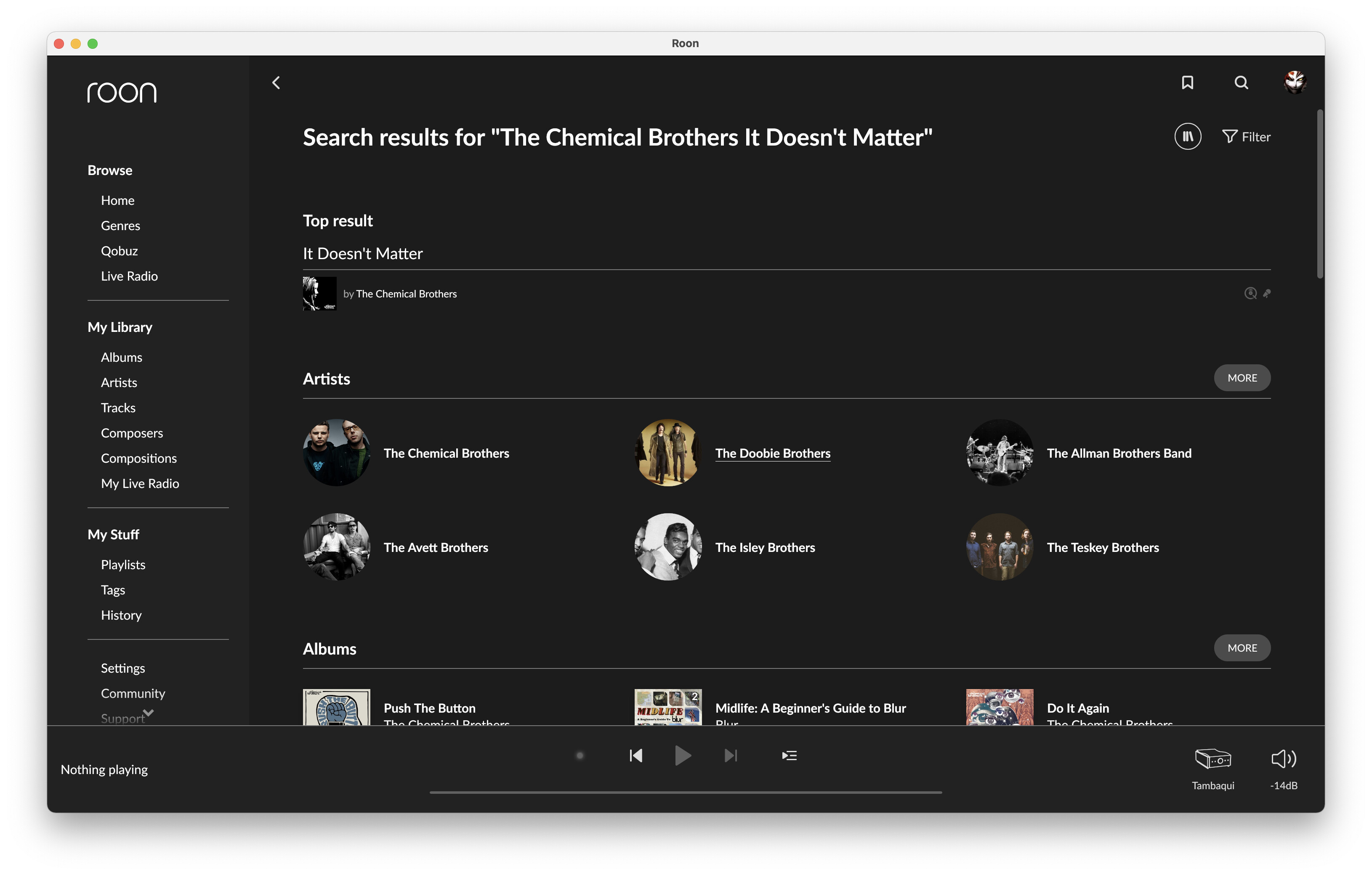 Trying to search for ‘It doesn’t matter’ by ‘The Chemical Brothers’.