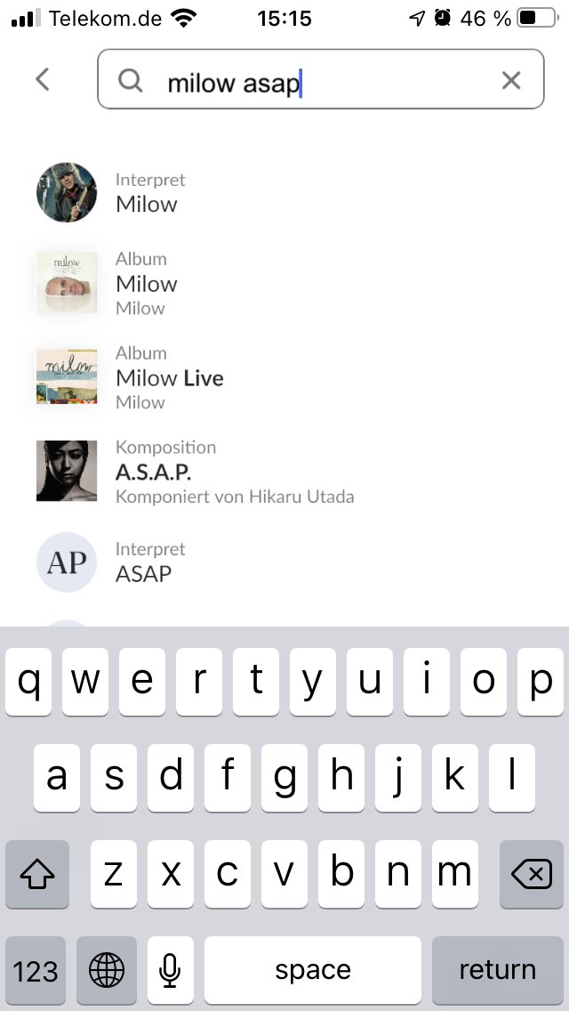 Update: Today Daily mix shown. Search is not working. For example typing „Millow ASAP“ in the search field gives a lot of results but not the title ASAP from the artist Millow.