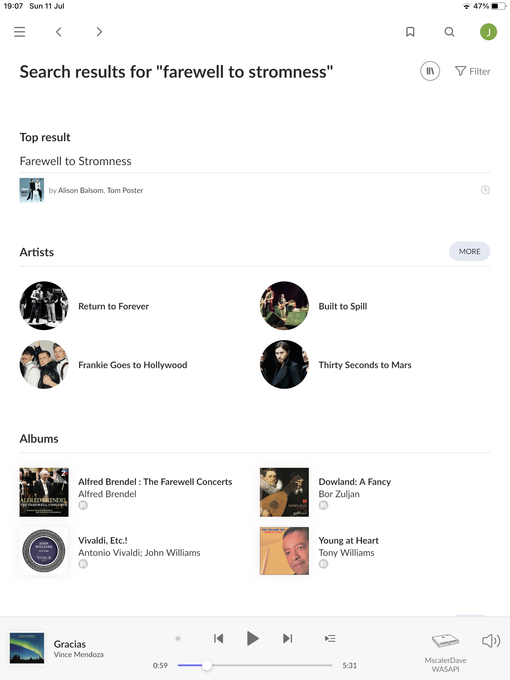So, what I would have liked is the “Farewell to Stromness” direct hits at the top. None of them are in my library, were one of them to be I wouldn’t mind it at the top, but I wouldn’t care. I might like a “my library only” button though, just like Focus has got.