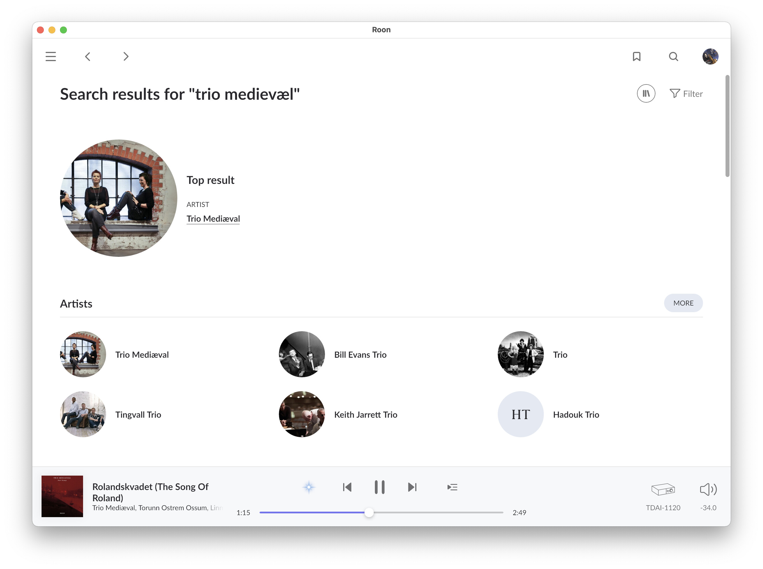Maybe it’s possible to guess what it is I’m trying to write, like now – Roon understood that I was looking for Trio Mediæval – and return that and other similar groups. Hits for “trio” is always going to be unspecific and probably not that helpful…