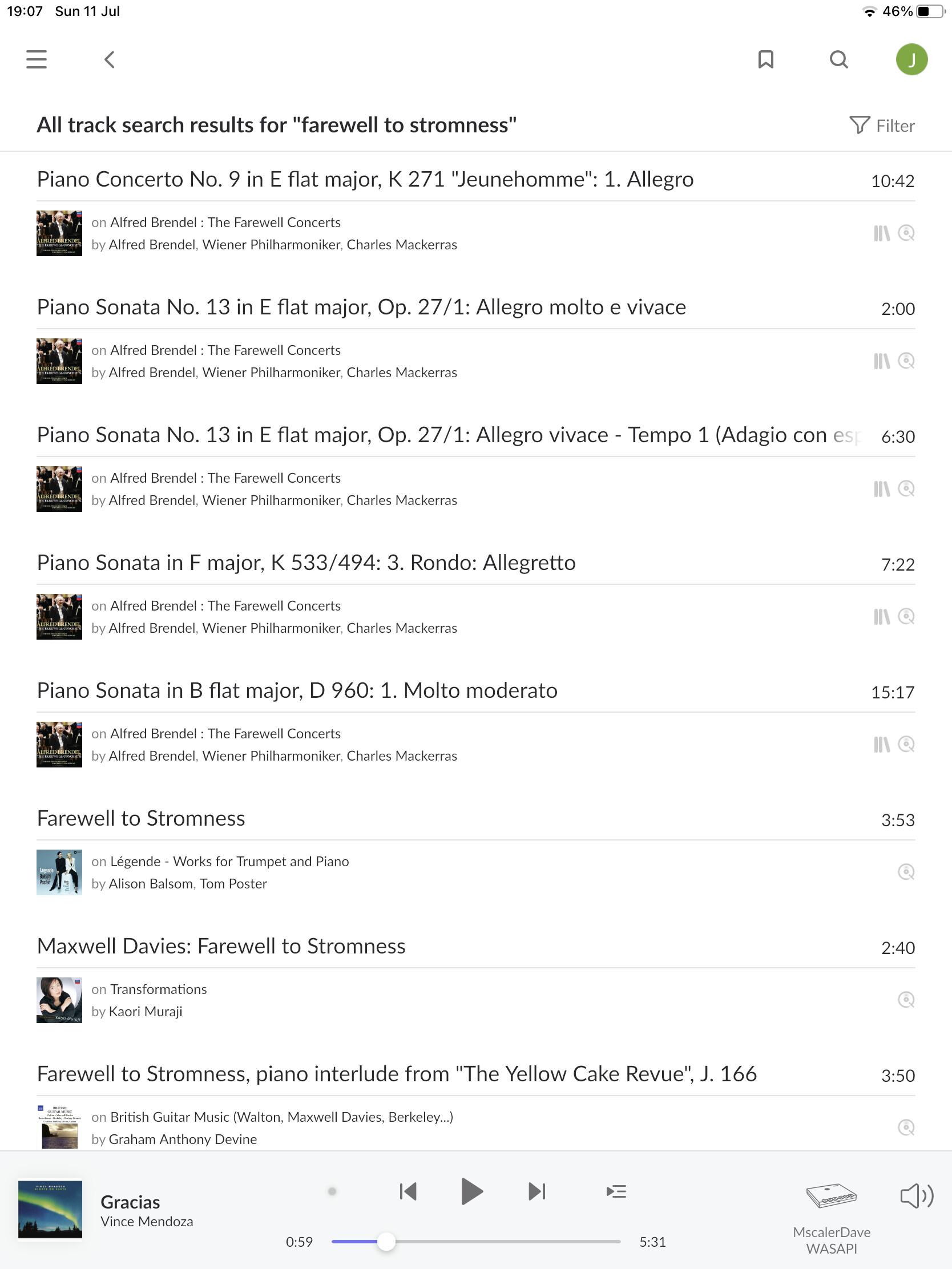 Not a “Farewell to Stromness” in sight. But brilliantly the first track is from the “Les Adieux” (farewell in French) piano sonata! So kinda 12 out of 10 for that, because it makes a connection across languages, but it still isn’t what I am looking for. This screen and most of the next screen of tracks are all from my own library and come from the likes of Farewell concerts etc. Then at the end, finally, Roon nails it and I have a whole list of “Farewell to Stromness” tracks.