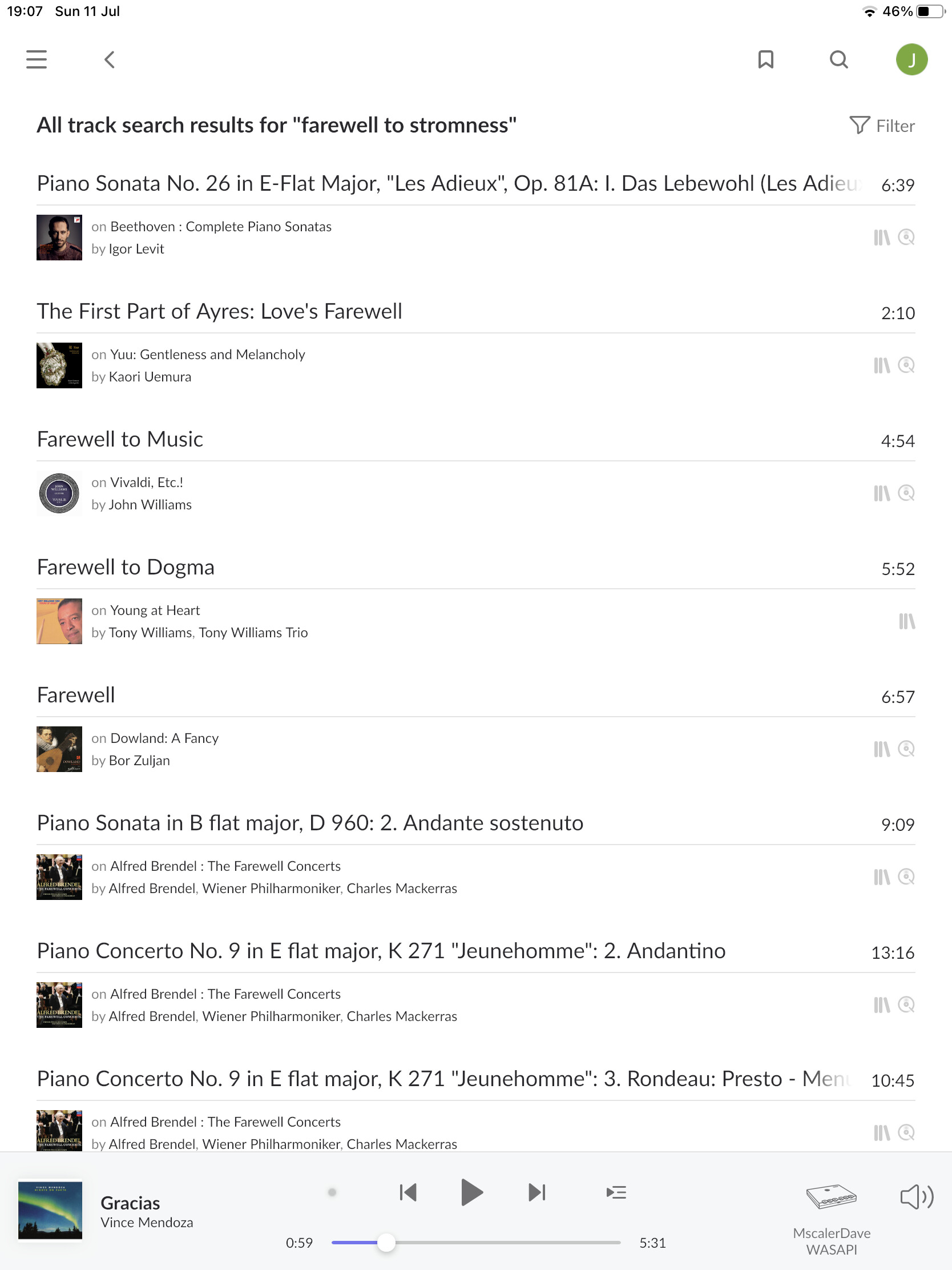 The Top Result actually nails the composition, but presents it as a track and but alas that’s not the track I want. Not interested in Artists or Albums, so let’s skip them though I daresay the albums have a track on them with “Farewell”. in the title. That brings us to the first page tracks:
