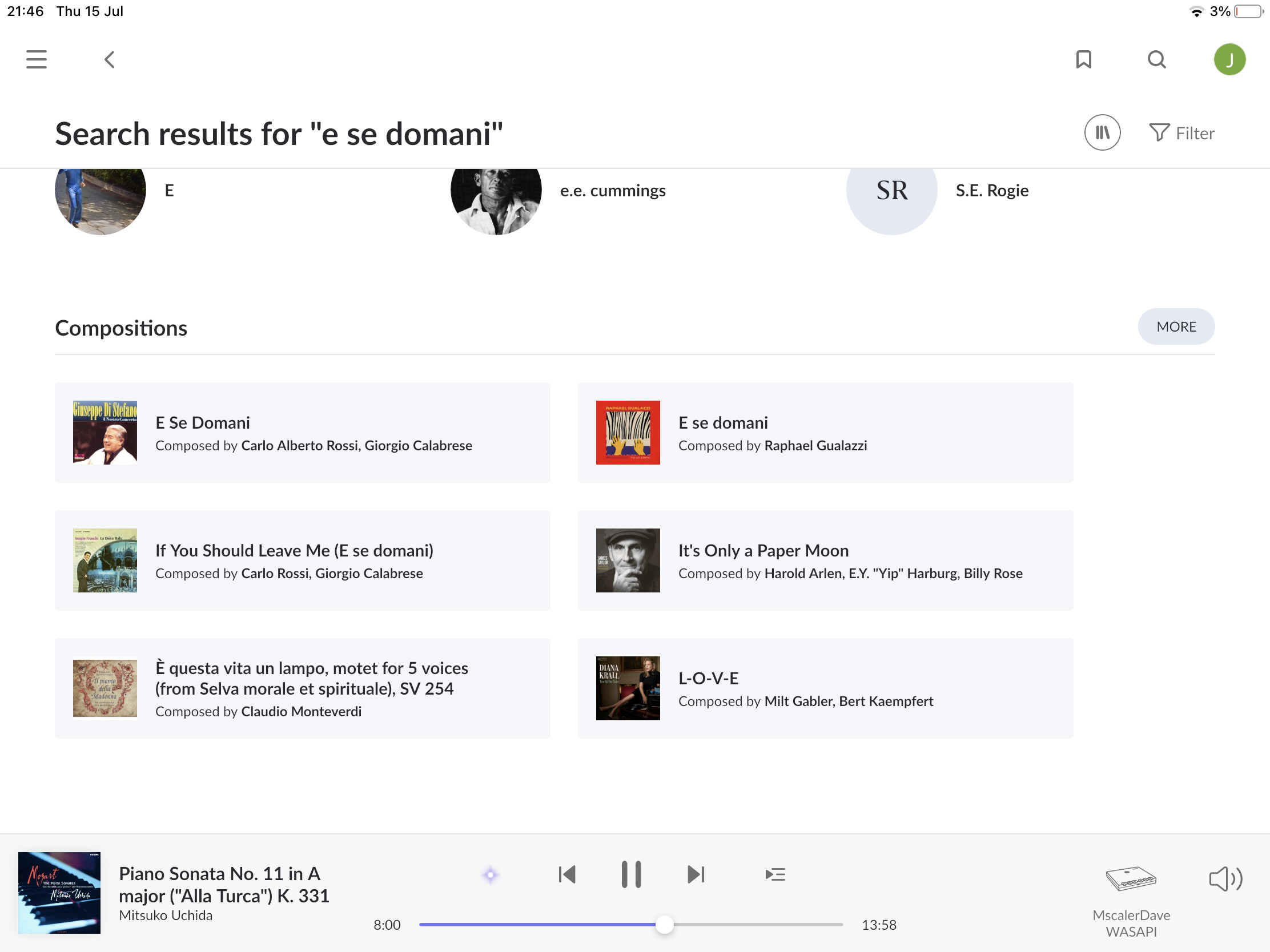 Search returns meaningless results. Below is an example searching for “e se domani”. iTunes returns the 5 tracks I have. Roon returns god only knows what.