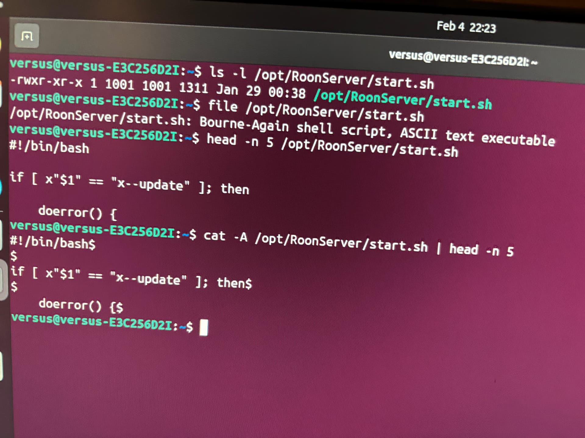 cat -A /opt/RoonServer/start.sh | head -n 5