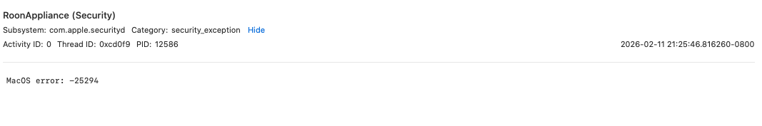 I have Roon Server 2.58 build 1608 running on a 2012 Mac Mini running Mac OS 10.15.8. Sometimes when I go to play music wia Roon Remote on my iPad or iPhone, I can see the track I wanna play, but then I press play it looks like its starting, then nothing happens. I see in the Mac Console error MacOS error: -25294 a lot, but not sure if its related. If I quit Roon Server via Activity Monitor, and then restart it, its fine for a while, but eventually it will fail again and I have to do the same thing all over again. This is a reasonably new problem that seems to have appeared since the last Roon update or maybe the recent Apple Security update for this OS, but to be honest, I cant remember exactly when it started, but all used to work fine. I realize that I probably need to buy a new Mac that can be updated to the most recent OS, but also, your website says that 10.15 is supported, so I thought I should try to get this issue fixed before ultimately taking that step.