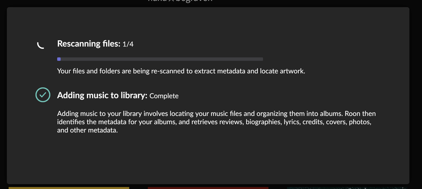 Tell us what's going on · After today’s latest update, my Roon server gets stuck on “Rescanning files.” It says it is rescanning four files to update the metadata, but it gets stuck on file 1 and the scan indicator keeps spinning all day. This is probably due to a corrupted file, but there is nowhere to see which file it is getting stuck on.