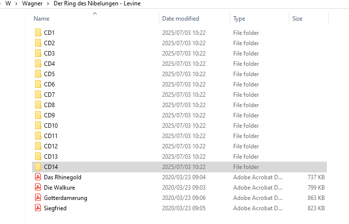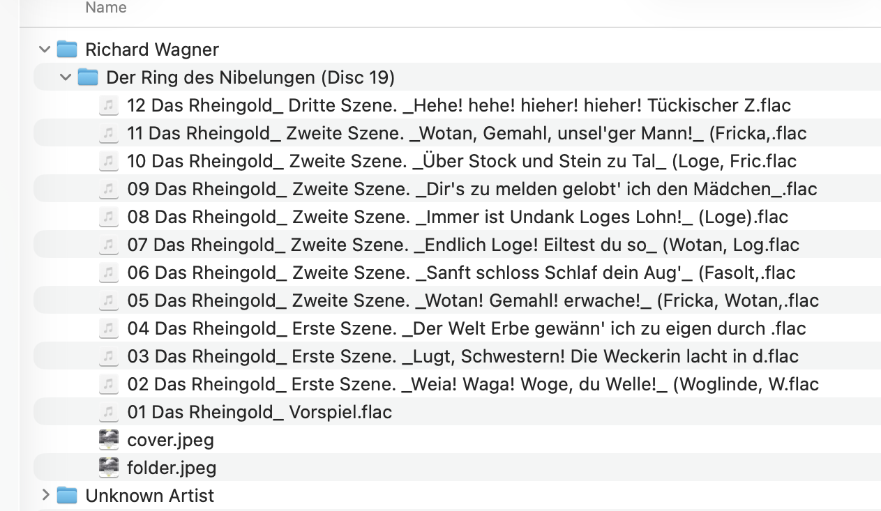 Since Roon is having difficulty, I would tag the release using MusicBrainz Picard (or a tagger that supports MusicBrainz), and ensure that track and disk IDs are included in the filenames, e.g. 01-01 Das Rheingold_ Act I. Prelude.