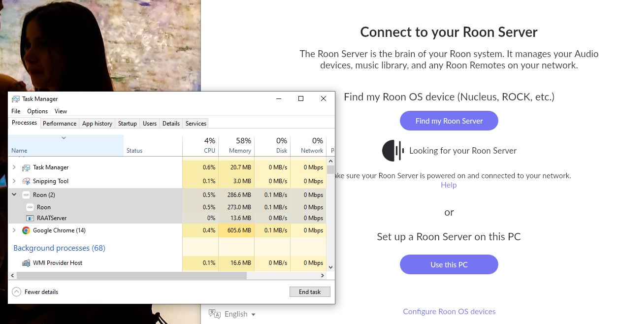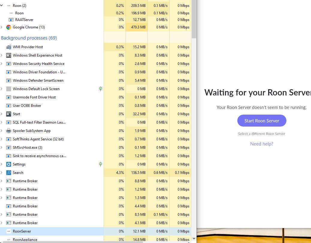 Actually, your Task Manager screenshot is only showing Roon and RAATServer running - your Roon Server is not shown. It should be listed in the Background processes section if it is running.