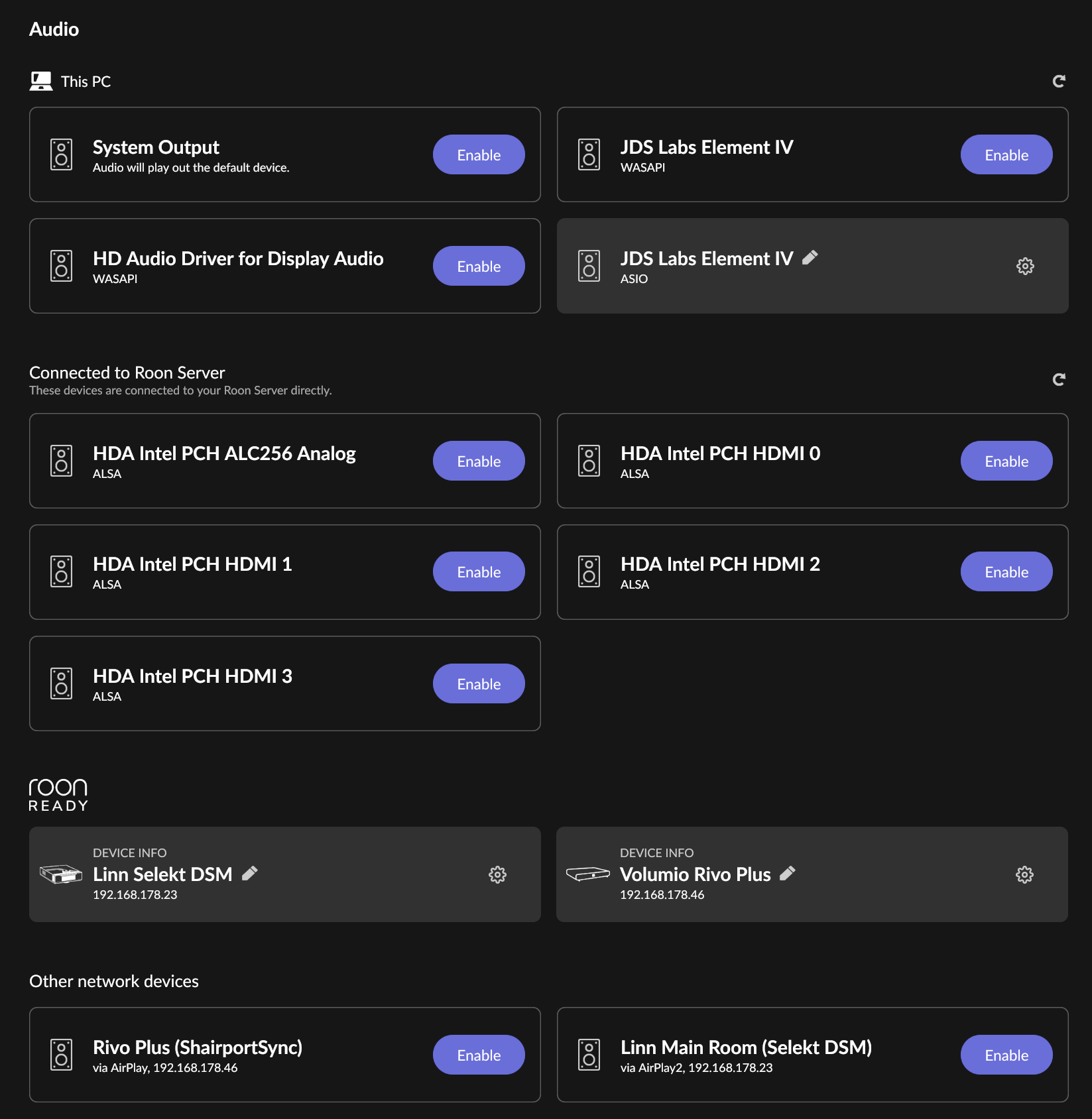 From the image above, I can see that there is a JDS Labs Element 4 connected to the PC running the Roon Client and it is enabled for use with the ASIO driver.