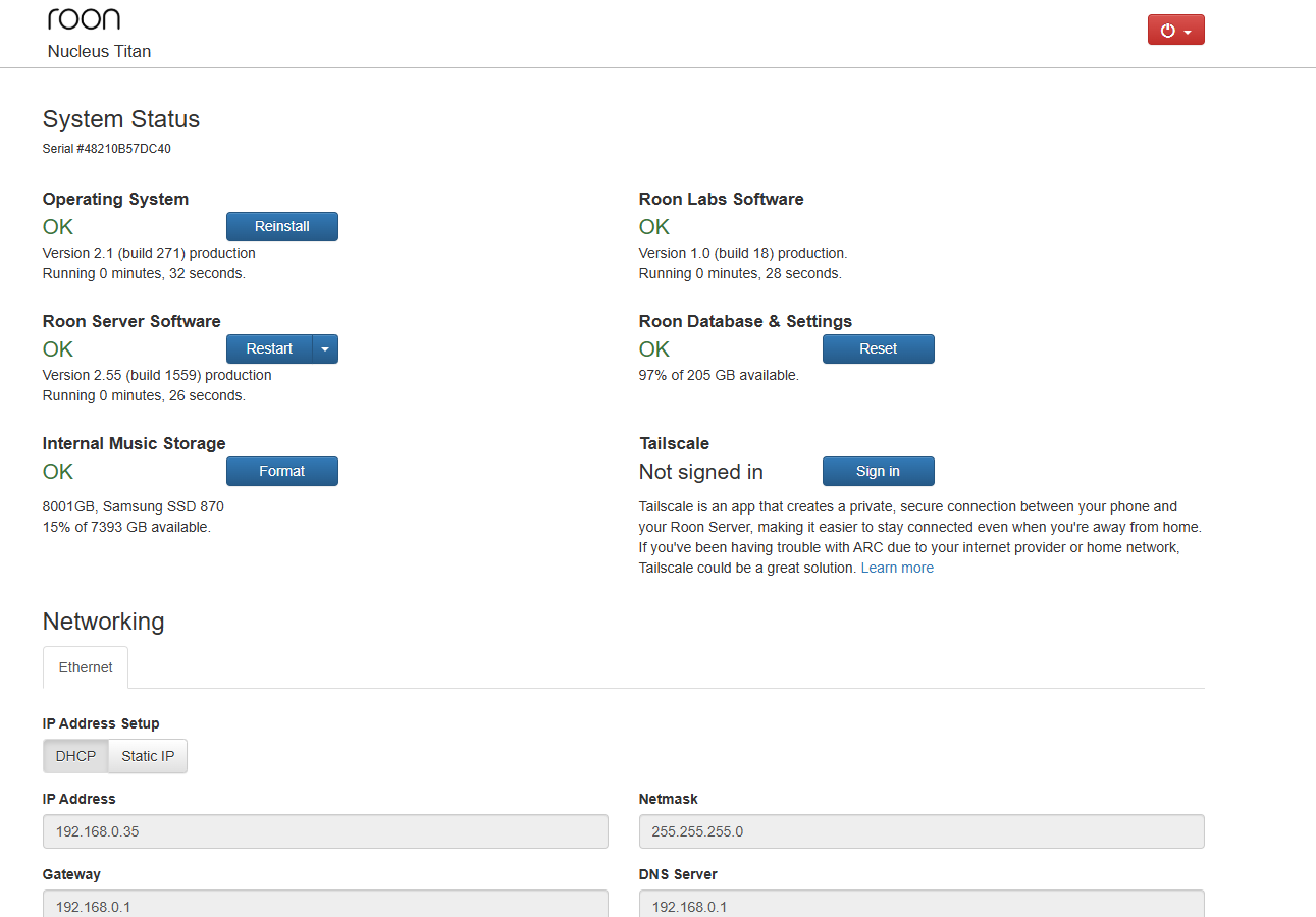 Keep in mind, since your Titan shows 192.168.0.x as its IP address all your roon clients incl. smartphone, regardless of wired or wireless, must also be in 192.168.0.x.