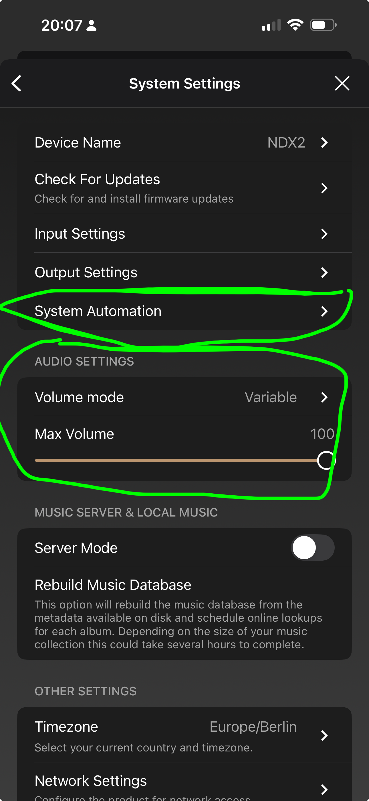 Disable System Automation in case you have it enabled (unlikely unless you have Naim amps). When System Automation is disabled, the Audio Settings are visible below it. Change the Volume Mode from Fixed to Variable.