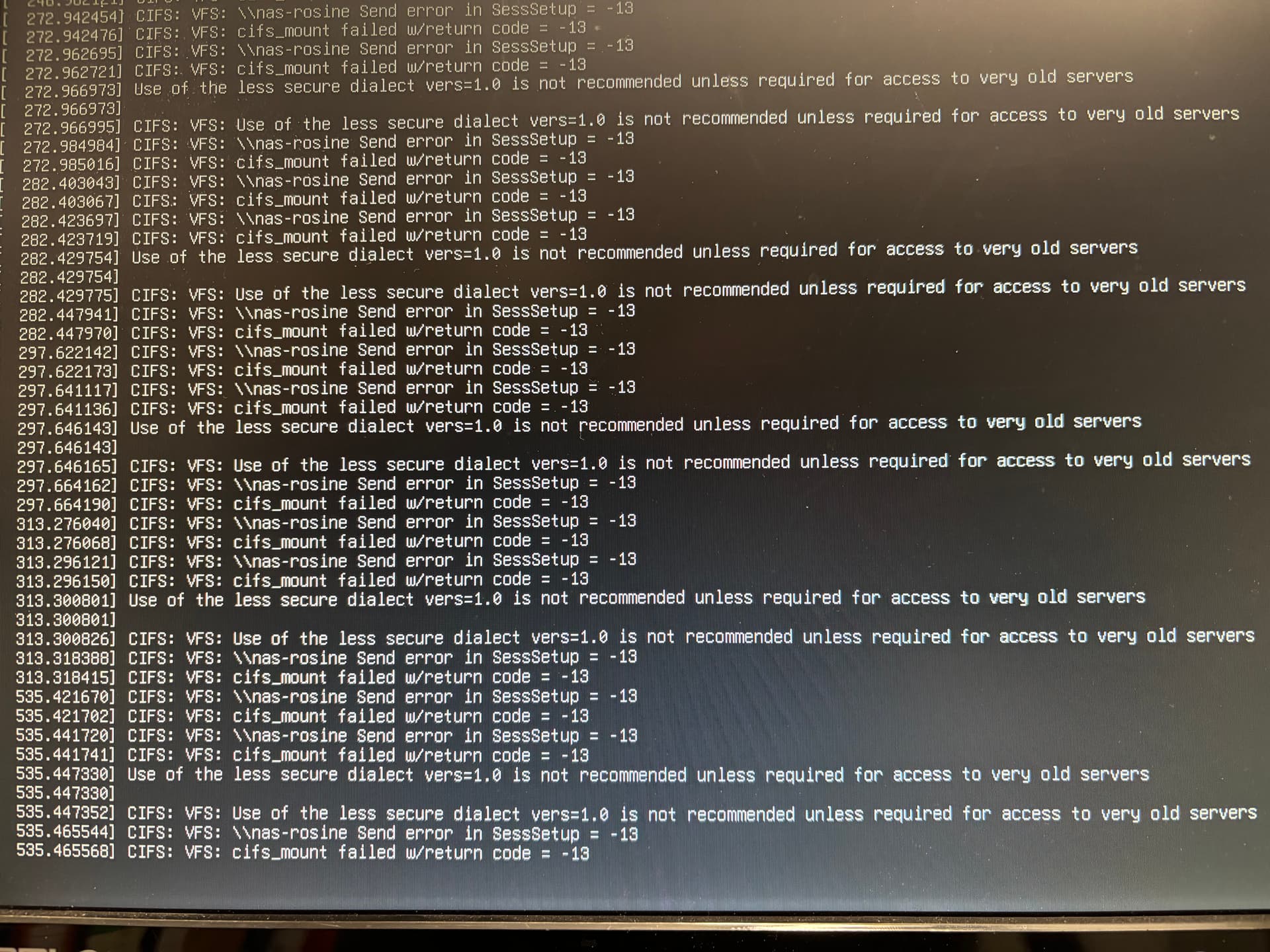 Dec 28 21:26:53 DietPi kernel: CIFS: VFS: \\nas-rosine Send error in SessSetup = -13