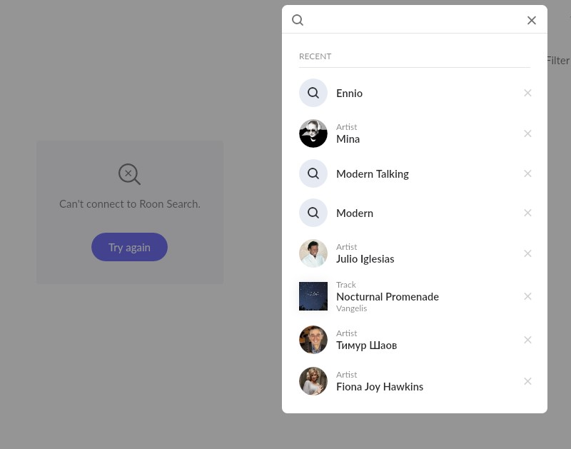 · I am experiencing problems with the Search function. When attemting to find an artist or an album Roon says "Searching for..." and after a while - "Can't connect to Roon Search". Prevoiusly searched items in the "Recent" list are loading fine, but any new search attempt fails.
