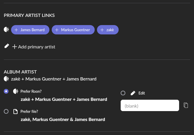 Hm yeah I figured it’s like this. I don’t think you can remove the second row except by turning off all three primary artist links, which you probably don’t want. But if you set the album artist to the three names separated by commas, then the first line should disappear while each name remains clickable. Might look neater, if you don’t have to have the pluses