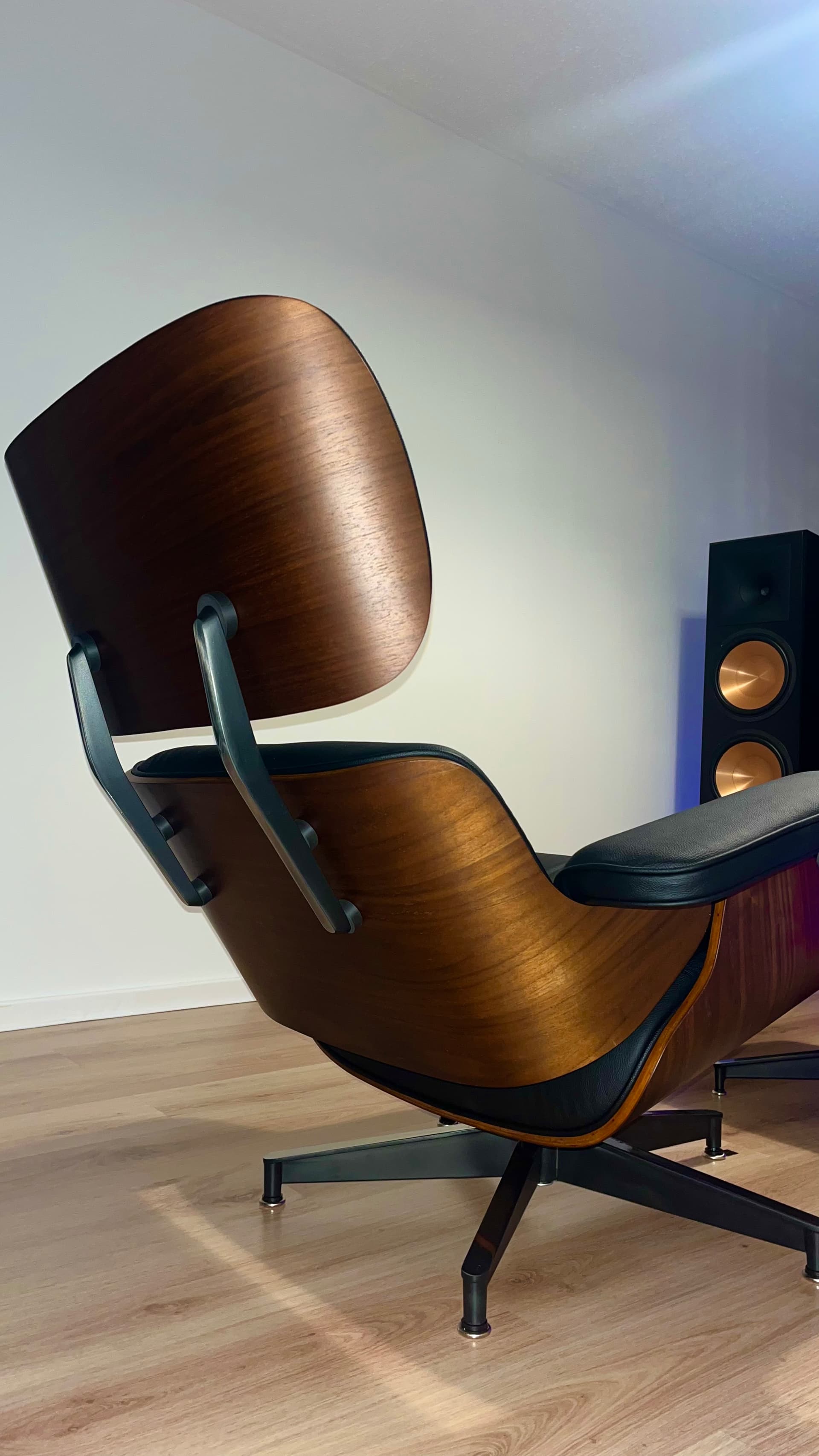 I’ve got this walnut Eames Lounge Chair (with the matching ottoman) right in the sweet spot. It’s been my go-to for a couple of months now, super comfy for those marathon Roon sessions (3+ hours no problem) great lower back/shoulder support, and the recline angle feels relaxing without forcing my head forward too much. The fixed, gentle backward tilt puts you in a relaxed, near-zero-gravity-like position that’s ideal for long, fatigue-free sessions