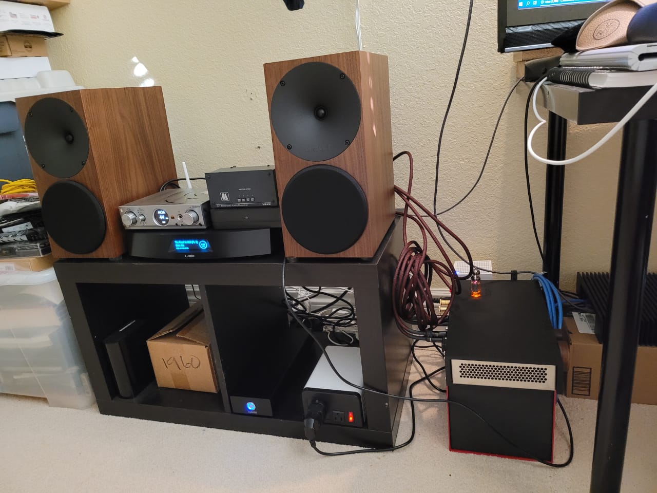 N±->Lumin U1 via ethernet (CAT8 gave network error, so used Lumin provided cable)–> Via USB to iFi iDSD PRO–>Via XLR to RCA Billie Amp–>Buchardt A500 via RCA to XLR.