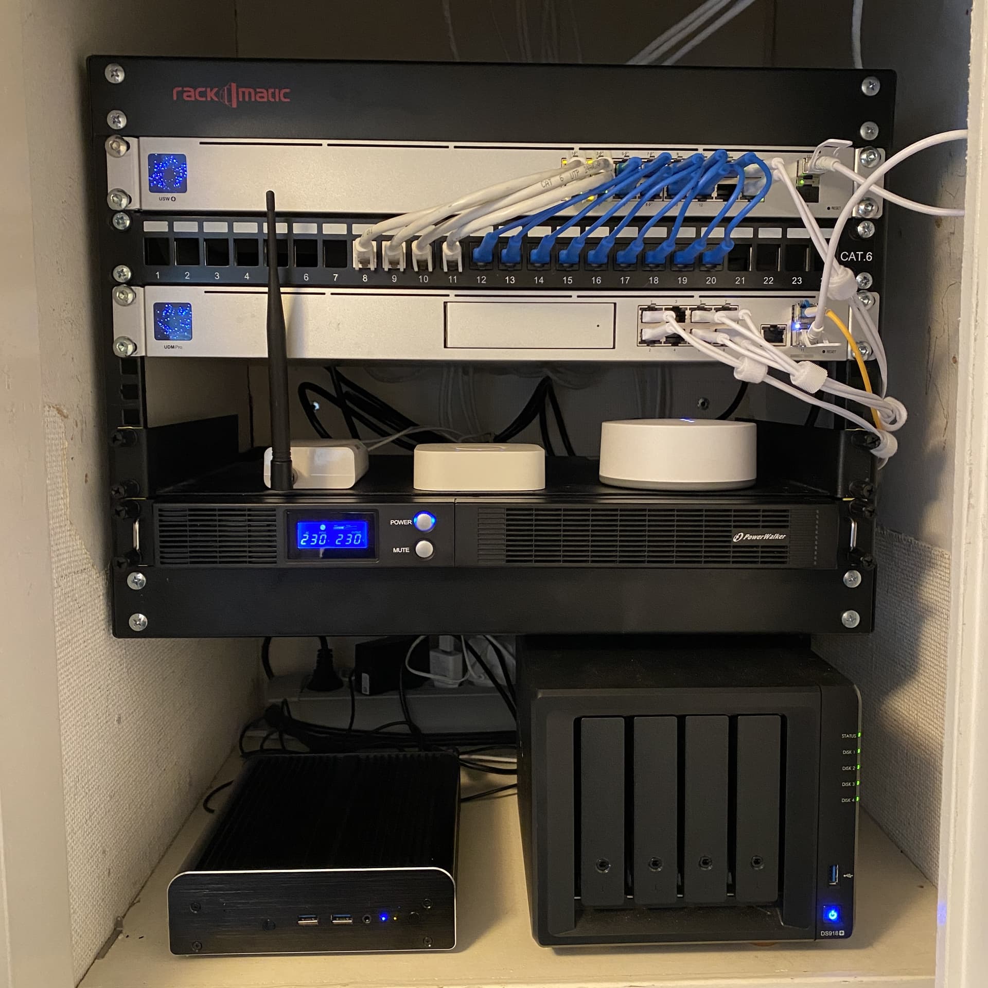Replaced all phone and TV-antenna sockets that are not used anymore with double network outlets. All cables runs through the attic and down to the patch panel in a hallway closet where also the incoming fiber is located together with my NAS storing all local music files, and the Intel NUC running ROCK.