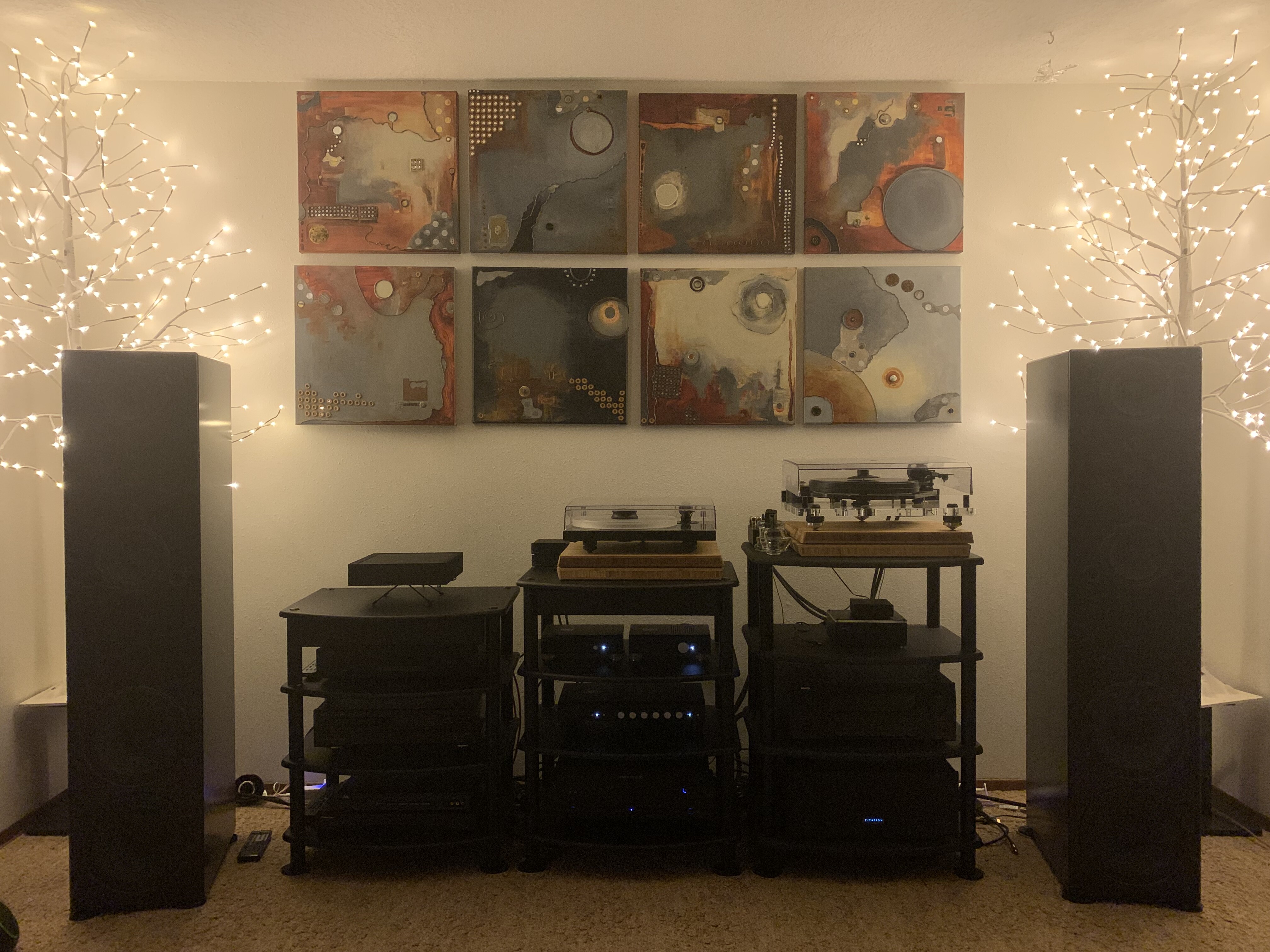 Finally got the wife’s art up on the walls and brought in an old Harman Kardon Citation 7.1 amp. Sounds great! This weekend I will rearrange the stuff.