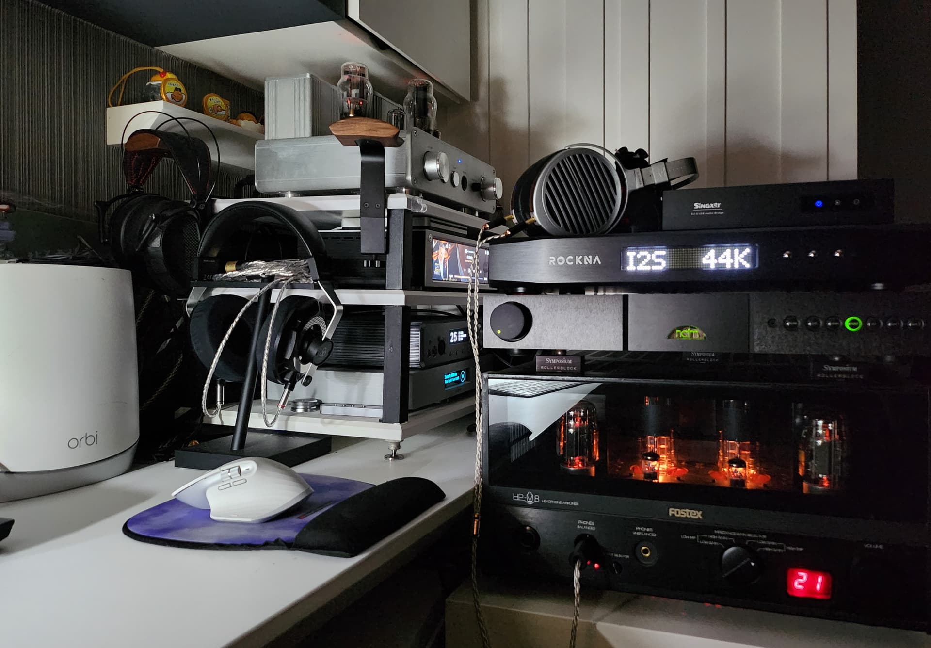 My mancave running Roon Core on QNAP TS473A, Rose RS250 as endpoint with a bunch of amps and cans. The other one is my 2 channels with Rose RS210E to Holo Spring 3, driving Ocrave V40SE and Buchardt S400 MKII.
