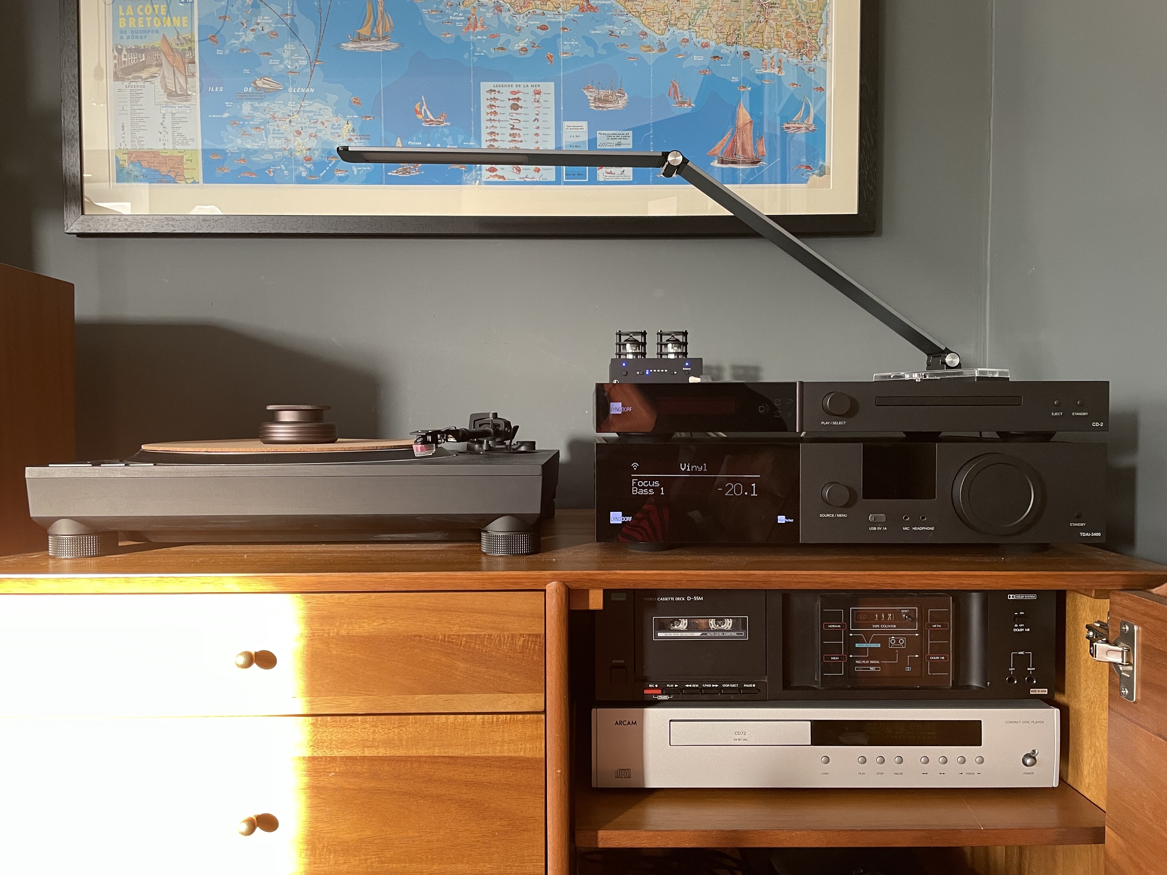 Forever tweaking here’s the latest evolution. Lyngdorf TDAI-3400, Lyngdorf CD-2, Technics Sl-1500C through a Pro-Ject Tube Box S2 (on demo). Speakers are Kef Reference 1s on SolidSteel SS-5s. Roon runs on a dedicated Mac mini. I also have a Sansui tape deck and an old Arcam CD72 connected in the unit.