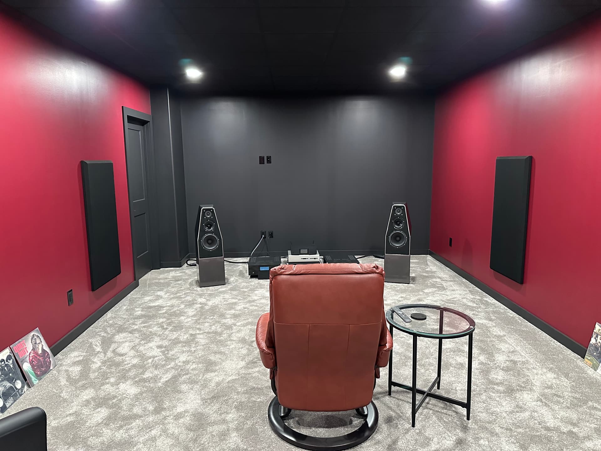 Finished the dedicated home theatre/man cave room in Mar of this year. Room colors are optimized for viewing a TV on the black front wall in complete darkness. Someday an 83" OLED will be in the budget. I have a few more LPs to frame and hang.