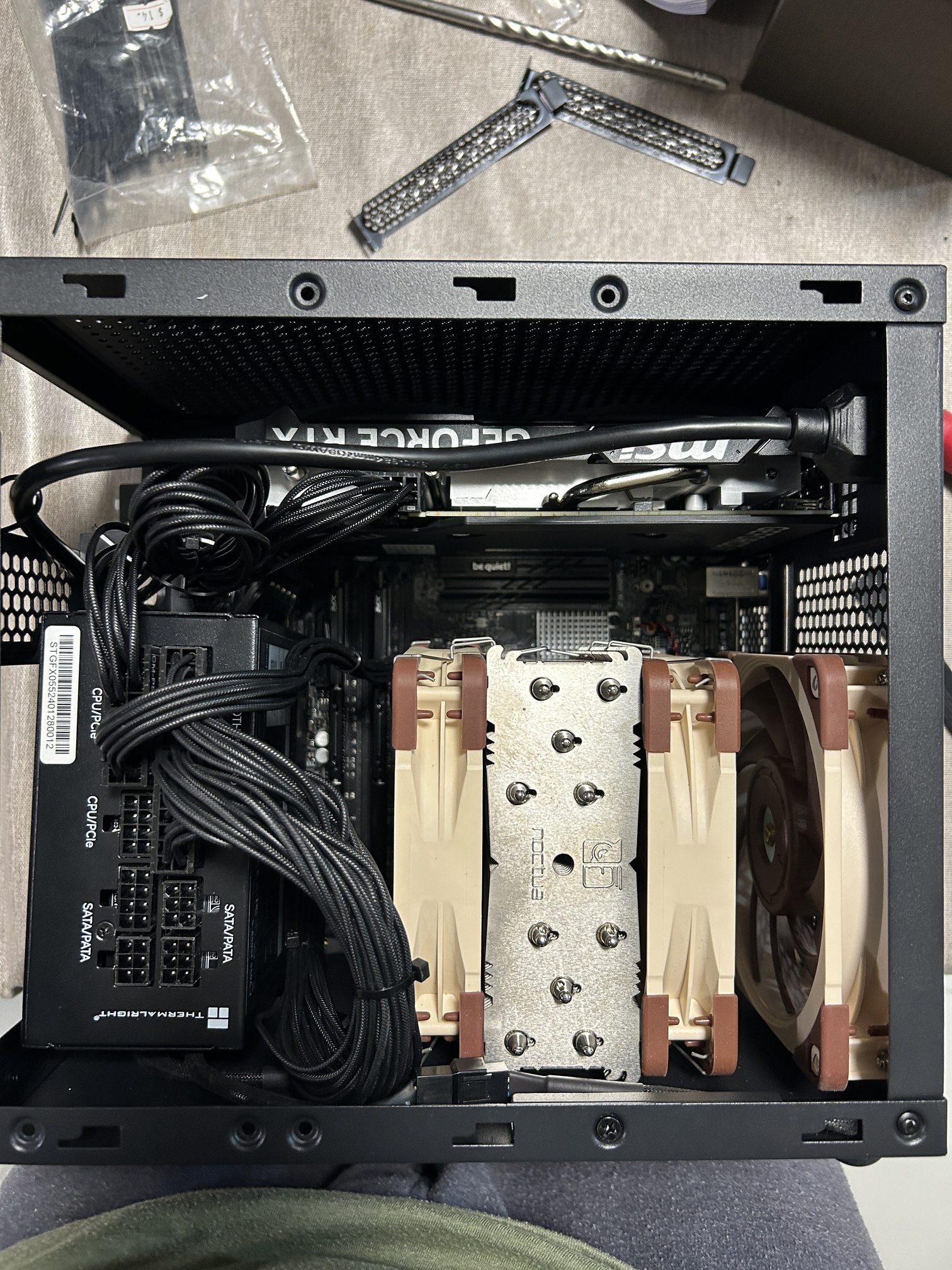 Have the cpu heat sink screws ready, so when you apply the paste and stickers on motherboard you will need to flip the case while holding the motherboard fixed to screw it back.