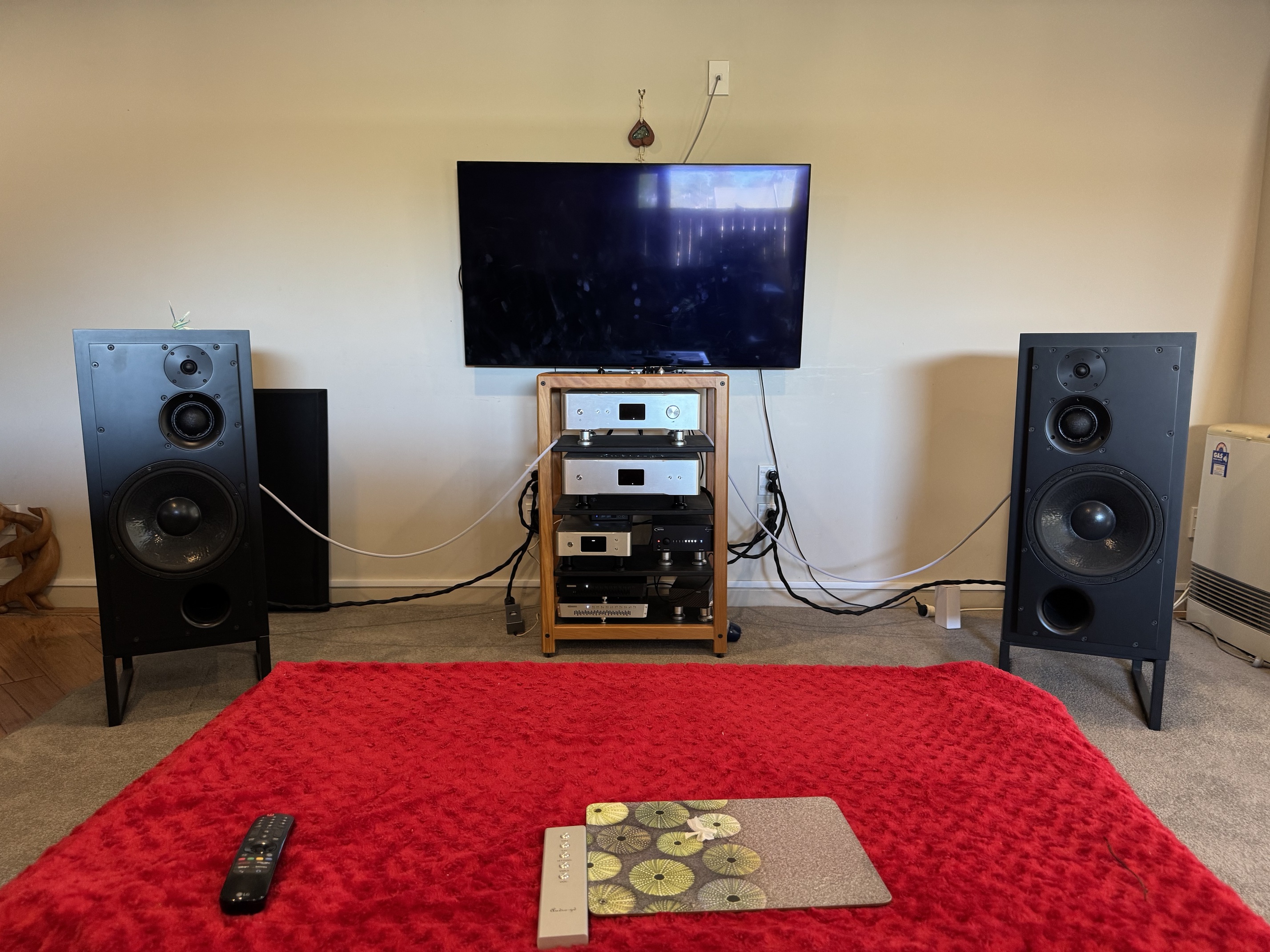 Looks a bit like my first lounge , one chair, somewhere for coffee/beer, 2 speakers ,rack of stuff , no cats ,no dogs no wife .