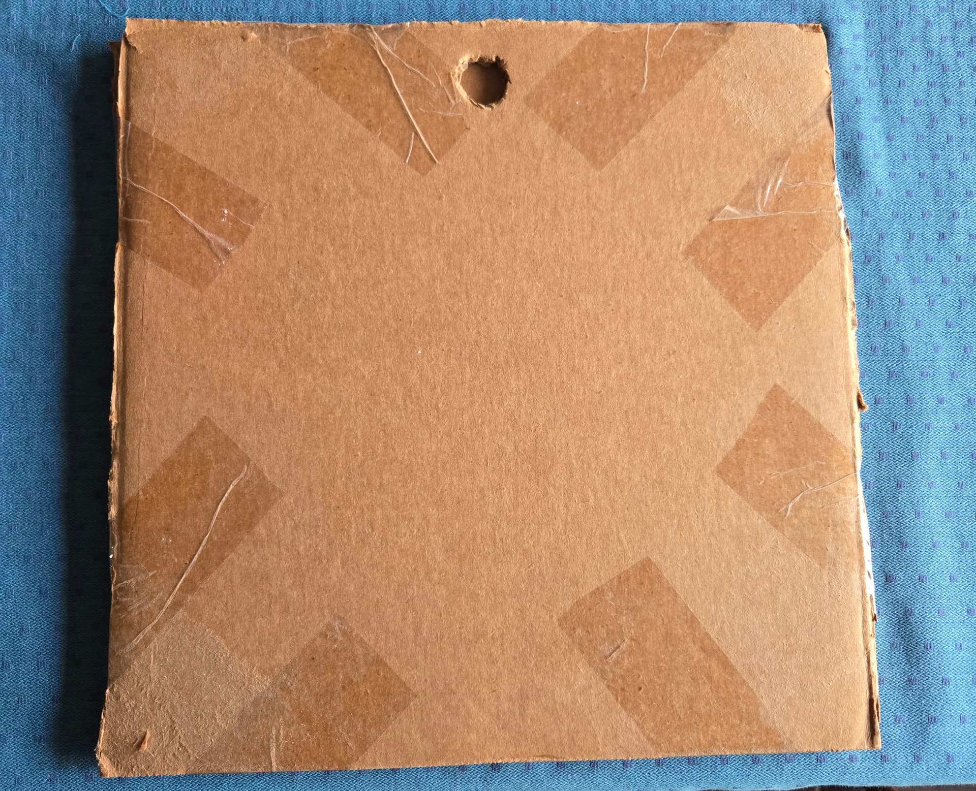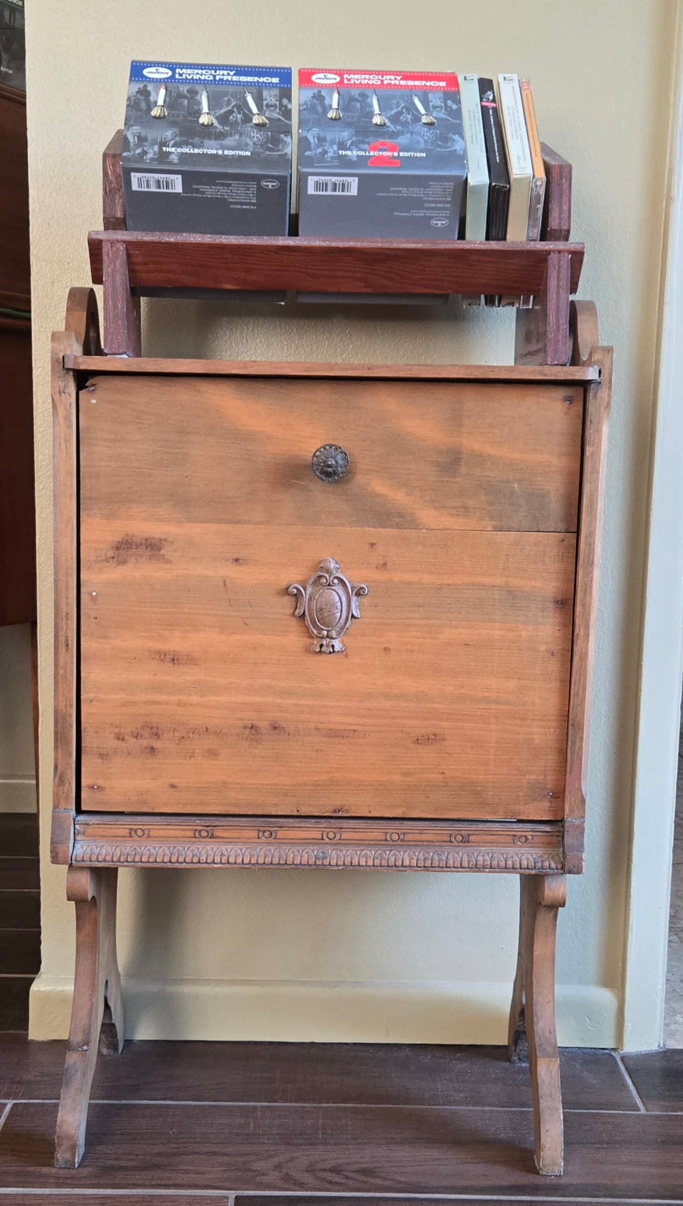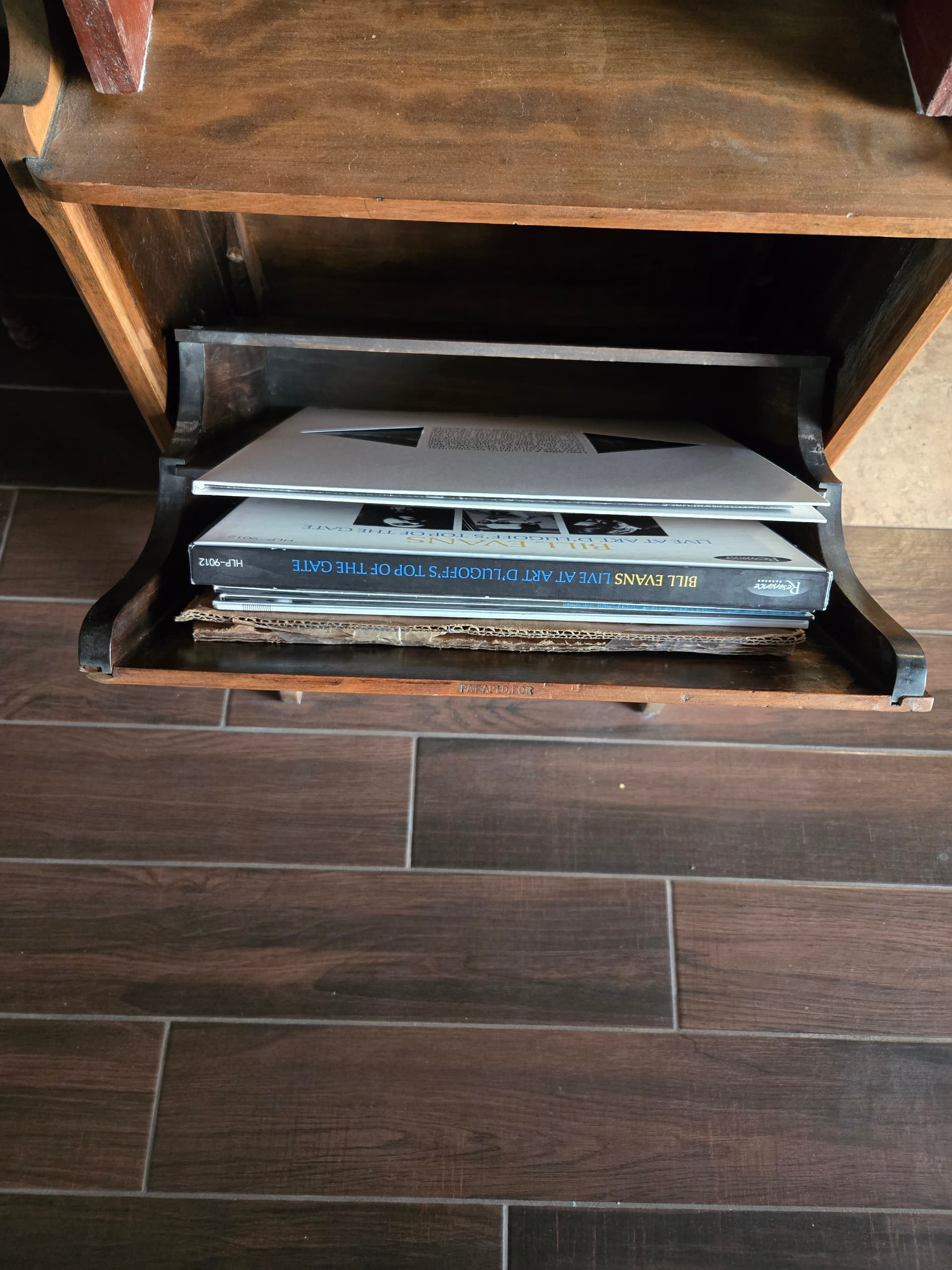 The CD holder is a separate shelf that just happens to fit on top of the record stand. Both came down to me from my late folks, who had a knack for finding such things. They used the stand for note taking under a wall-mounted phone, and they stored telephone books inside. (Remember those?) I re-built and lightly refinished it – it’s all original, except that the base of the tip-out shelf was attached with worn leather straps. Very likely, the years of heavy phone books took their toll. I cut strips from the backs of leather work gloves (which had worn-out fingertips) to do that repair. The two-layer cardboard spacer is what we used to call in the Peace Corps “a locally appropriate solution.” The cut-out hole prevents damage to albums from the the handle bolt head.