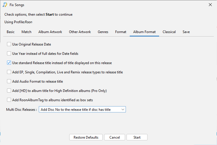 Okay so I noticed one significant issue, Multi Disc Releases is currently set to Add Disc No to the release title if disc has title, but it should be set to Never add Disc No information to the release title