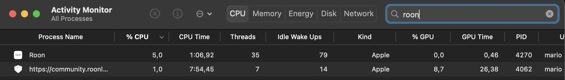 When playing it uses a bit more CPU, I guess for play graphics or so, but also just the Roon process there