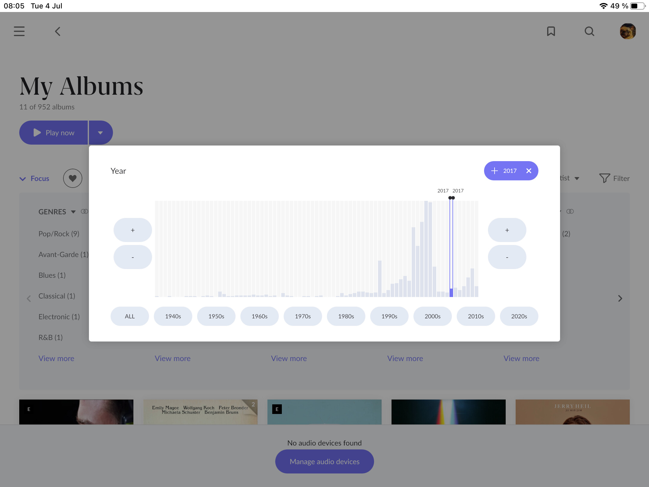 Thank you for your reply. Unfortunately, rebuilding the database will not help since this problem is related to the media you imported to your library. Let’s try finding this faulty album with a simple first step. Seeing as the release date which breaks the Discover page starts with 2017 and this problem has started to appear recently for you, I’d suggest doing the following: