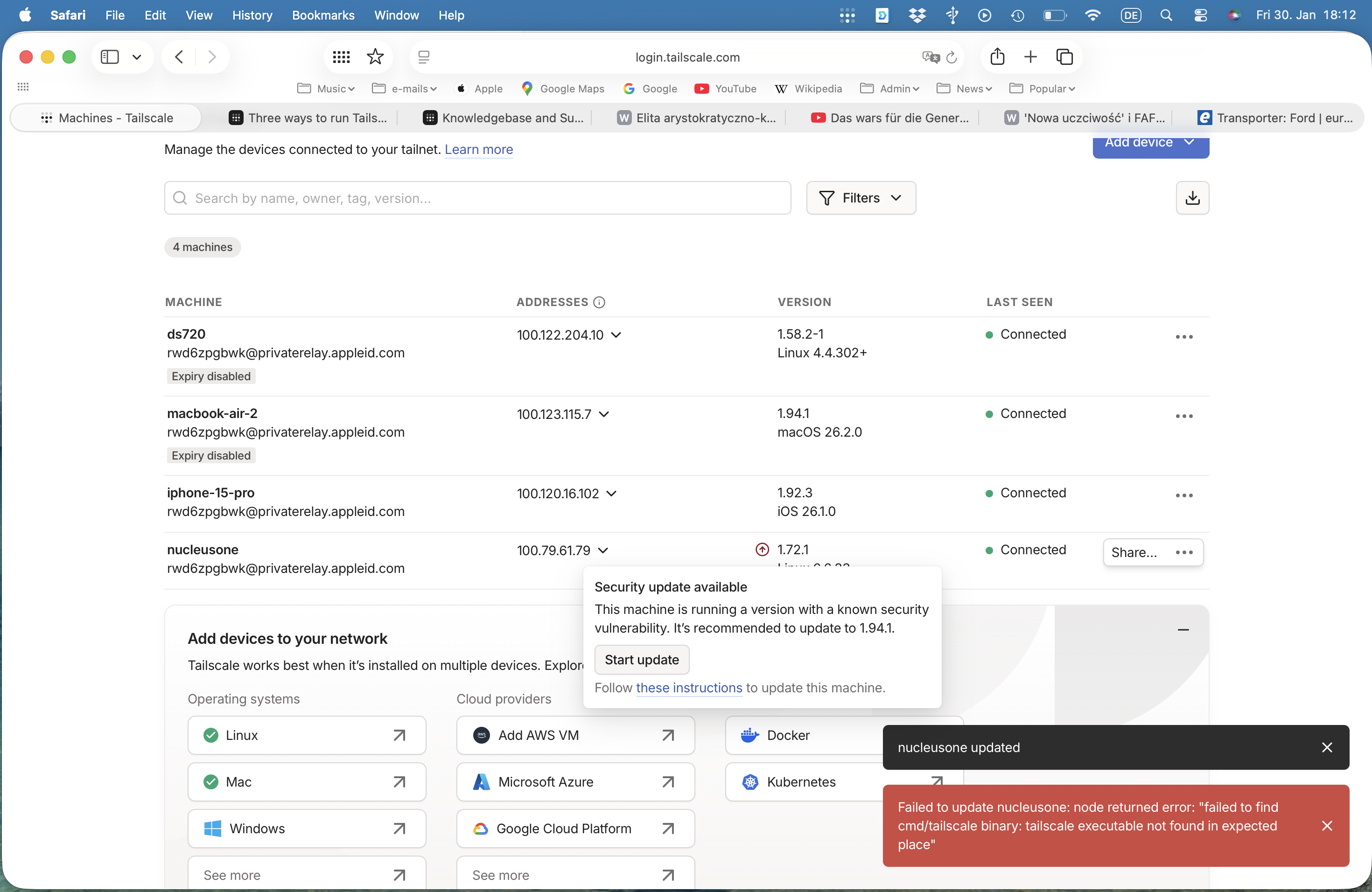 · I had some issues with the Roon ARC connections earlier, hence I have installed Tailscale. I have got four machines connected to it: laptop, phone, Nucleus One and Synology NAS. The reason for NAS connection is because I host my digitised music there and not in Nucleus One (historical reasons). The Tailscale software is up to date on all machines, except for Nucleus One. The Tailscale version on it is 1.72.1 for Linux 6.6.33 and when I want to update it I receive firstly an info: "Security update available: This machine is running a version with a known security vulnerability. It’s recommended to update to 1.94.1.” and then when I press the button “Start Update” I get two conflicting messages: “nucleusone updated” and “Failed to update nucleusone: node returned error: "failed to find cmd/tailscale binary: tailscale executable not found in expected place””.