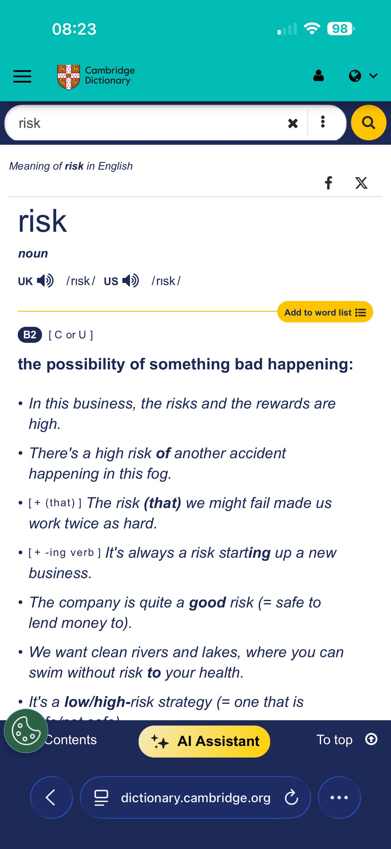 The Cambridge English dictionary agrees with me as well, as it states: Risk is âthe possibility of something bad happeningâ