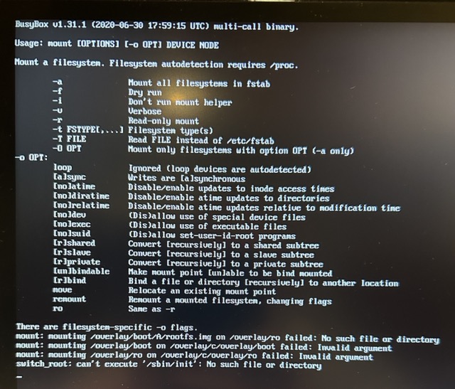 I'm installing Roon on an Intel NUC (8i7BEH) and everything was going smoothly until Roon was installed and I rebooted my NUC. Instead of seeing the screen welcoming me to Roon, I get a text only screen starting with "BusyBox" that appears to be telling me I need to mount a file system ("Filesystem autodetect requires /proc."), but I'm not able to type anything. I thought it might be a bad SSD, but I've replaced that and get the same error. Please let me know what might be causing this and what I can do to resolve this issue. Thank you.