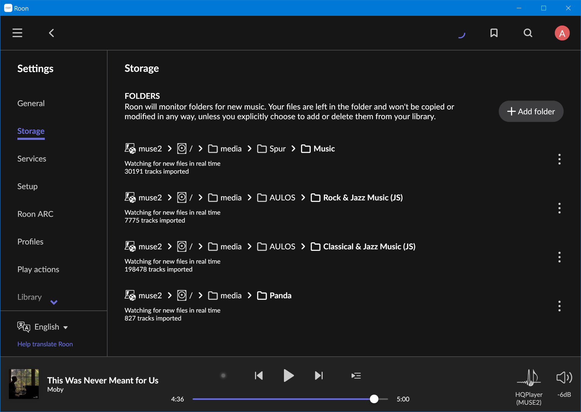- My local music is all stored on SSD within ‘muse2’ the machine running Roon server, so I think that would be local storage. I don’t have any folders on network storage or USB devices;