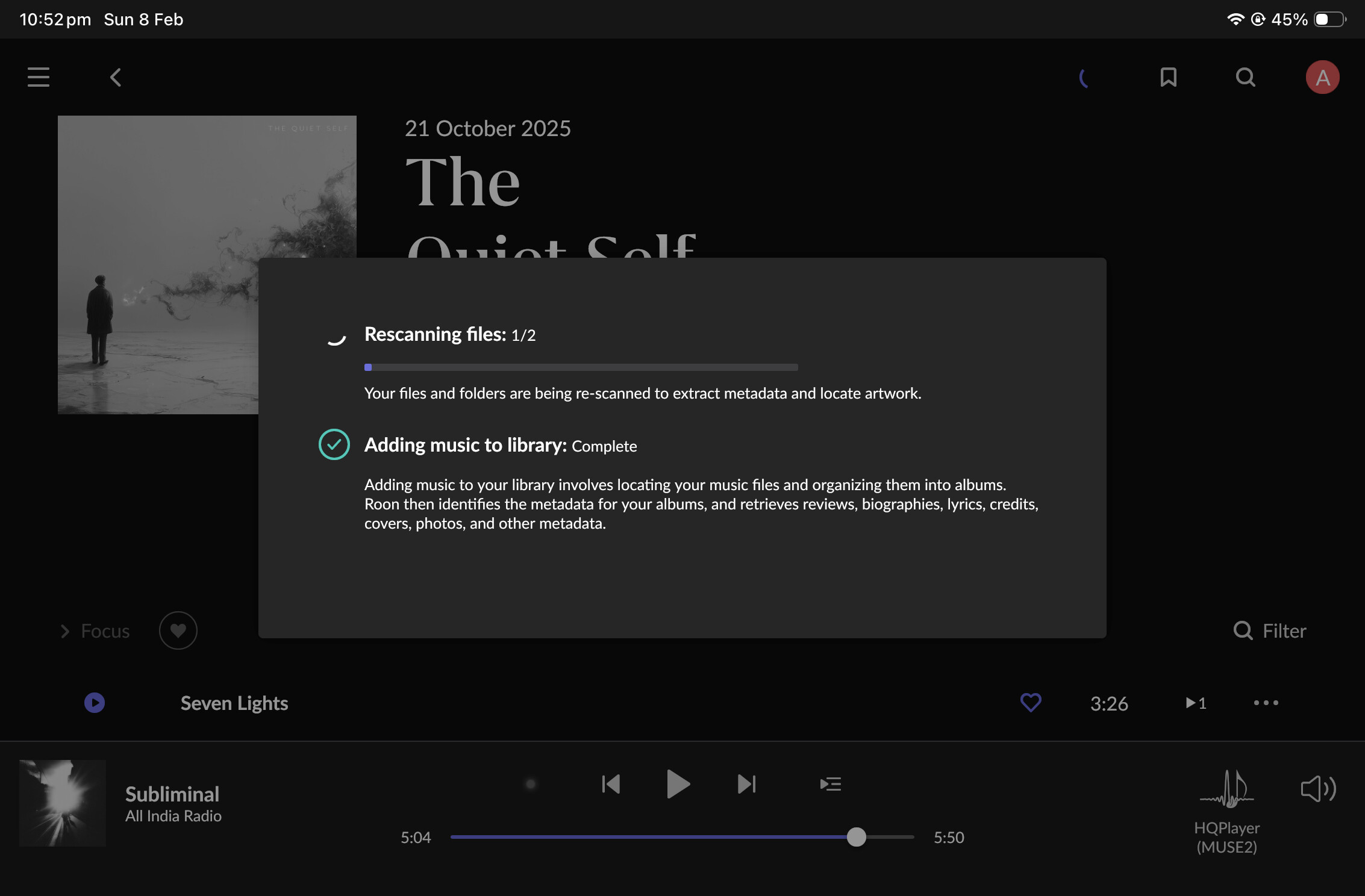 Hi, all! The latest EA build contains a fix for this problem which prevents Roon from getting stuck after triggering a manual Album/Track rescan. For those who are already in this state, this problem should disappear next time the background procedure runs. If that does not happen, let me know in the thread please.