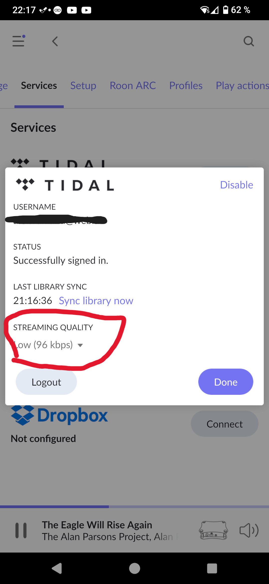 I logged out of Tidal under Rock and then logged back in.