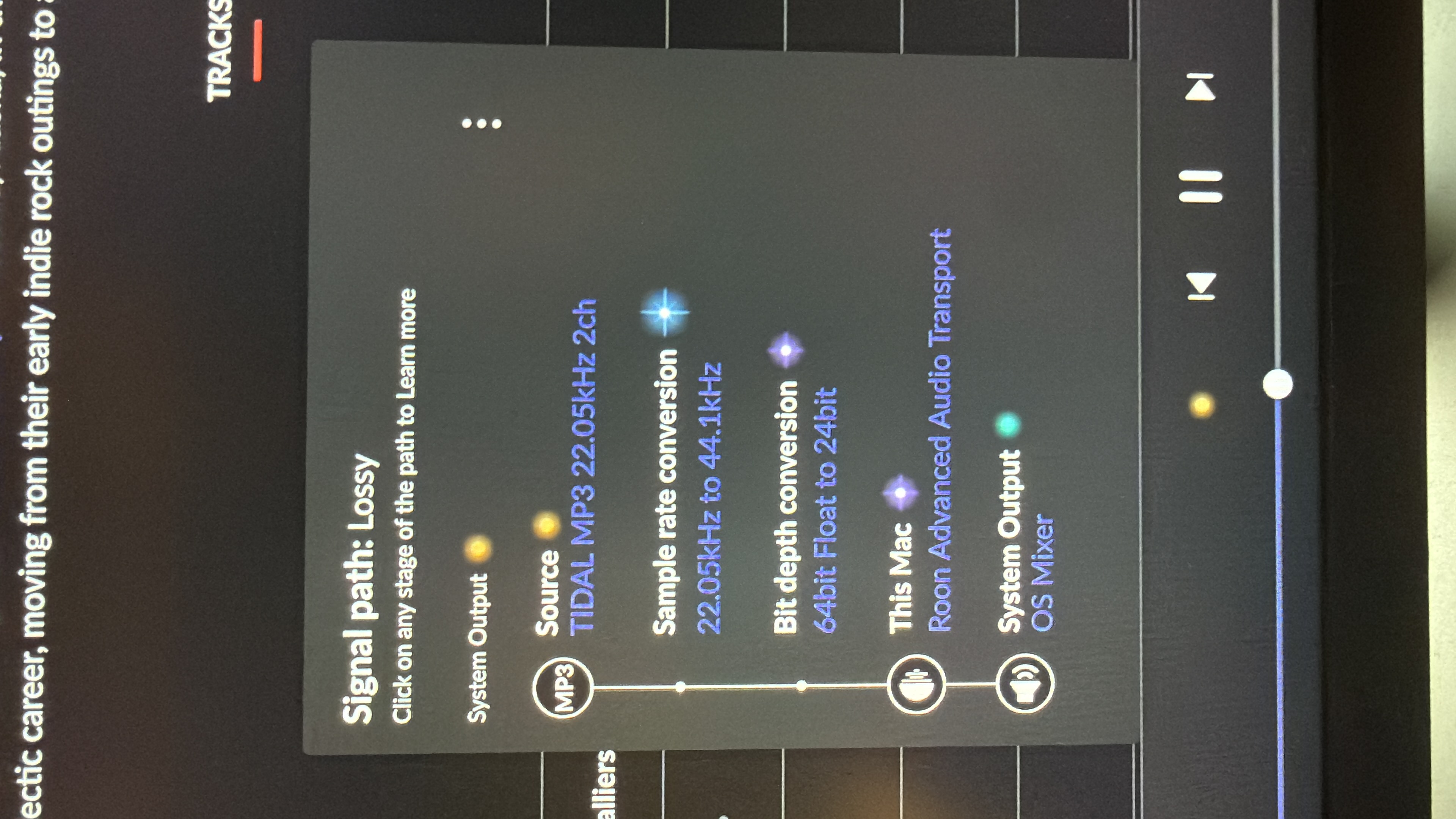 · Dear Roon support team, I'm logged in with Tidal on your MacOS app and almost every song I play on your app plays in mp3 22khz while on Tidal's app it's lossless flac. I think it's a bug. Could you please assist me? Thanks, Neta