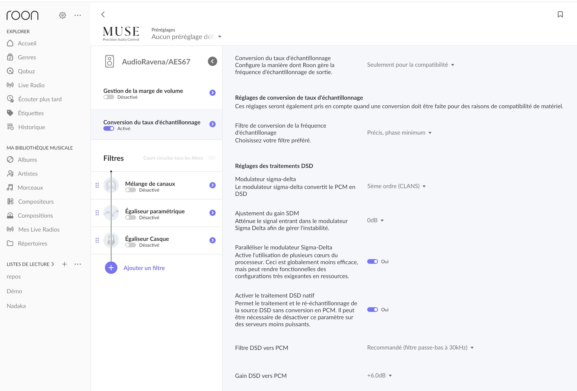 · According to my previous thread, almost fixed by the support team (ROON loses control of device with ‘Initialization failed’ message (ref#1P5KAR) [Ticket in] ) Merging support helped me to fix some issues, essentially because there were Sample Rates conflicts between NADAC (+ PLAYER) and ROON. Actually I still have some issues when some tracks are starting. NADAC tries to find the right Sample Rate coming from ROON. Stuttering starts each time I am choosing a track having a different Sample Rate than the previous one. I mean I change the album I want to listen to : the Sample Rate is different, the Nadac stutters at the start of the first track of this new album. Is there a setting I have to do in the Roon settings to avoid this issue. Thanks.