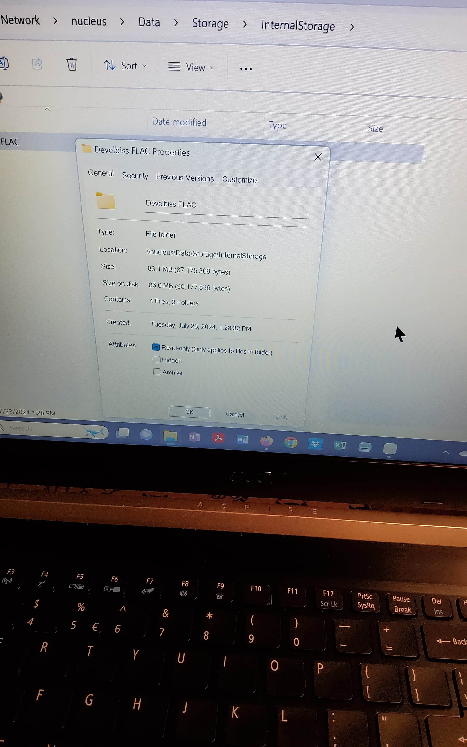 2. Notice the difference of the “develbiss flac” folders…one shoews 4 files, which were copied after my first attempt, and one with 722 folders that is the original on my d drive, that is the file I want on the nucleus.