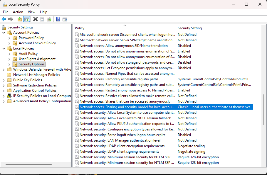 Network access: Sharing and security model for local accounts > set to Guest only - local users authenticate as Guest