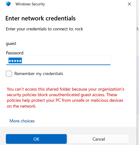 · I am attempting to add missing codecs to my Rock (running on Nuc), and I am getting an error message when using guest login to \\rock\data from my Windows PC that I "can't access this shared folder because your organization's security policies block unauthorized guest access..."