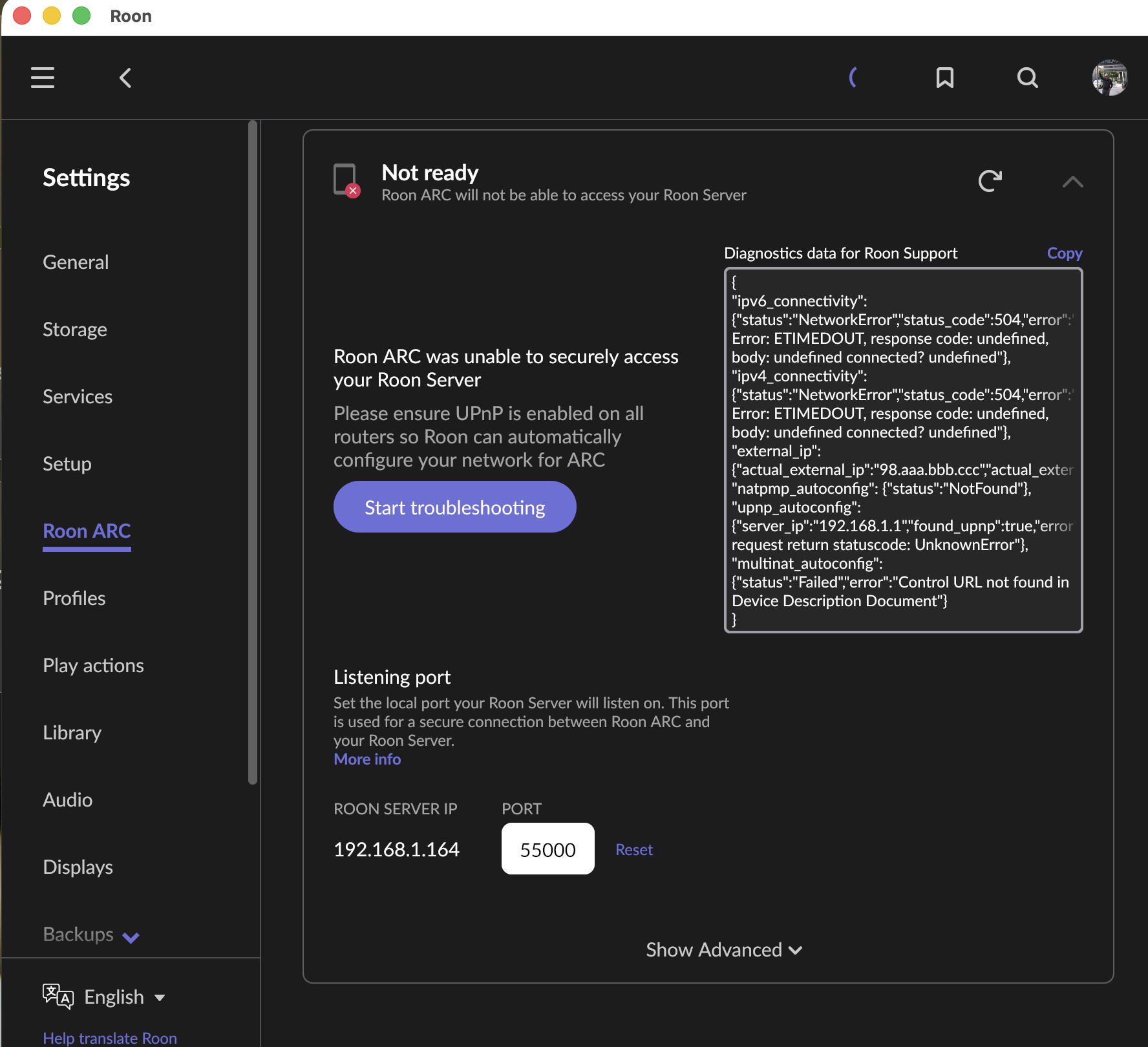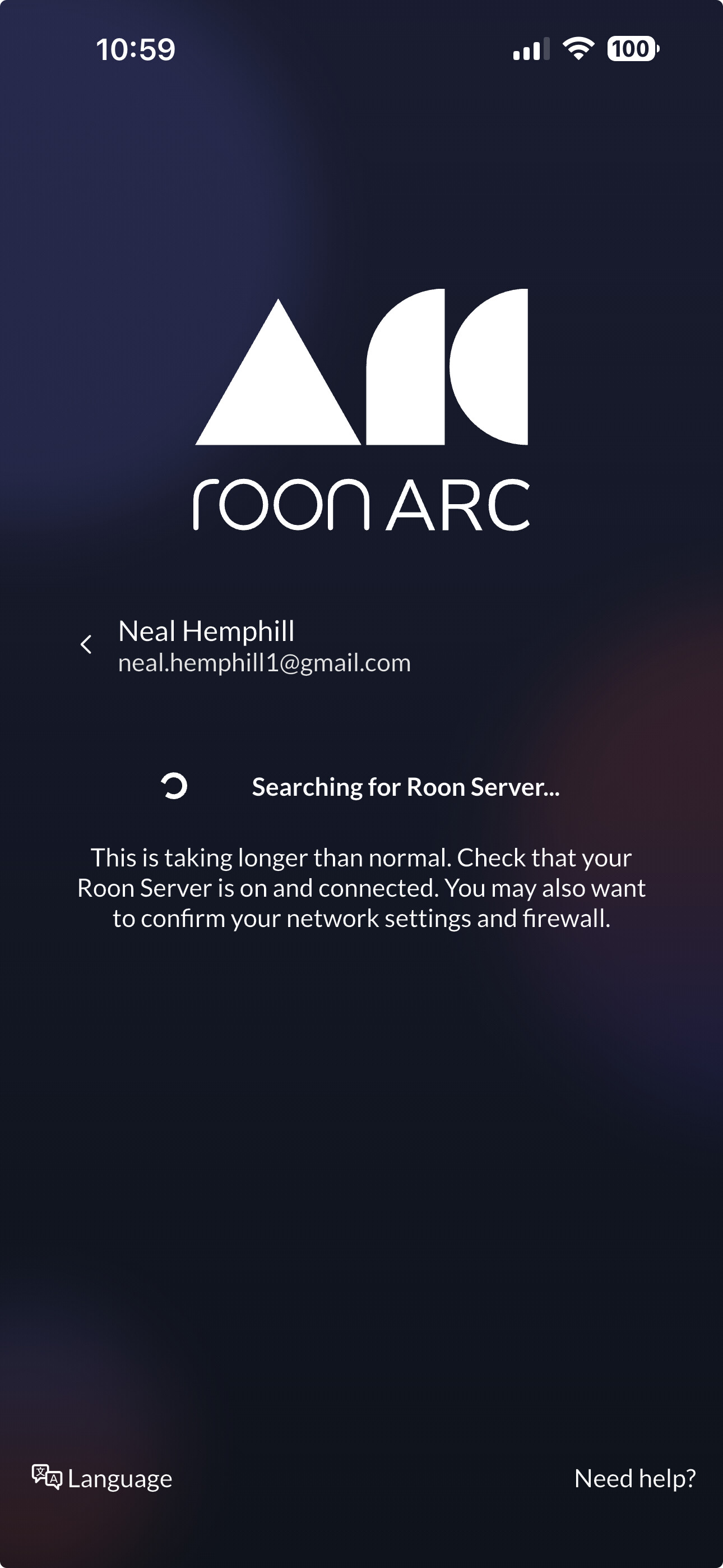 This is what’s happening when I open ARC, sitting in front of my computer with the Roon server, which is working perfectly fine.