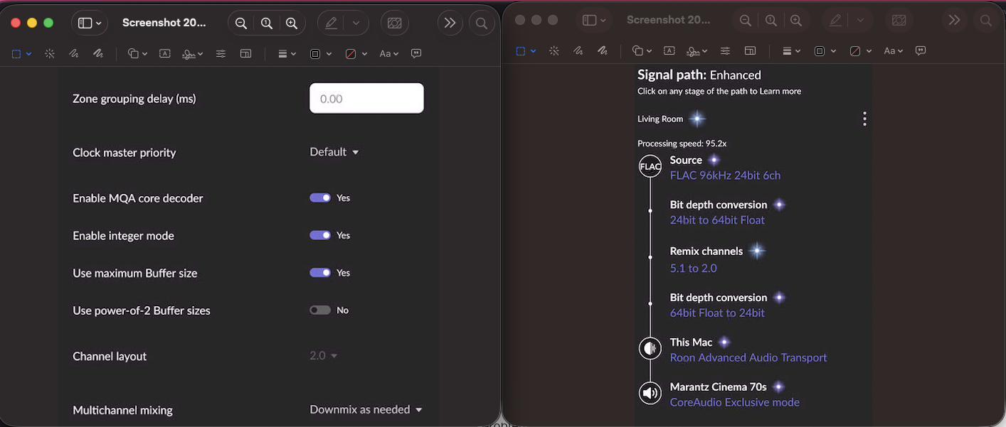 your pic on the left shows that Roon is set to play in 2 channel mode (channel layout - 2.0) and to downmix channels (Multichannel mixing - Downmix as needed). Have you tried setting channel layout to 5.1?