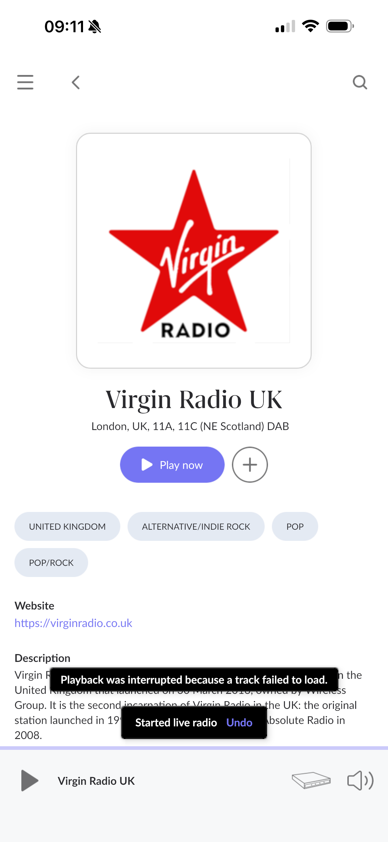 Having been able to stream virgin radio normally for as long as i can remember. I now get a message saying track failed to load. This occures even after i have tebooted the system mutliple times.