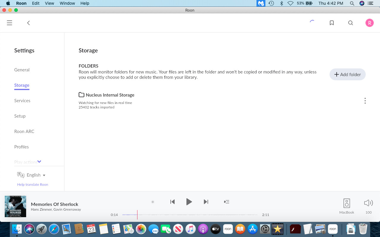 Can you also provide some more information on your Roon configuration? I am not sure I understand how your Nucleus, library, and MBPro are configured given your statement: