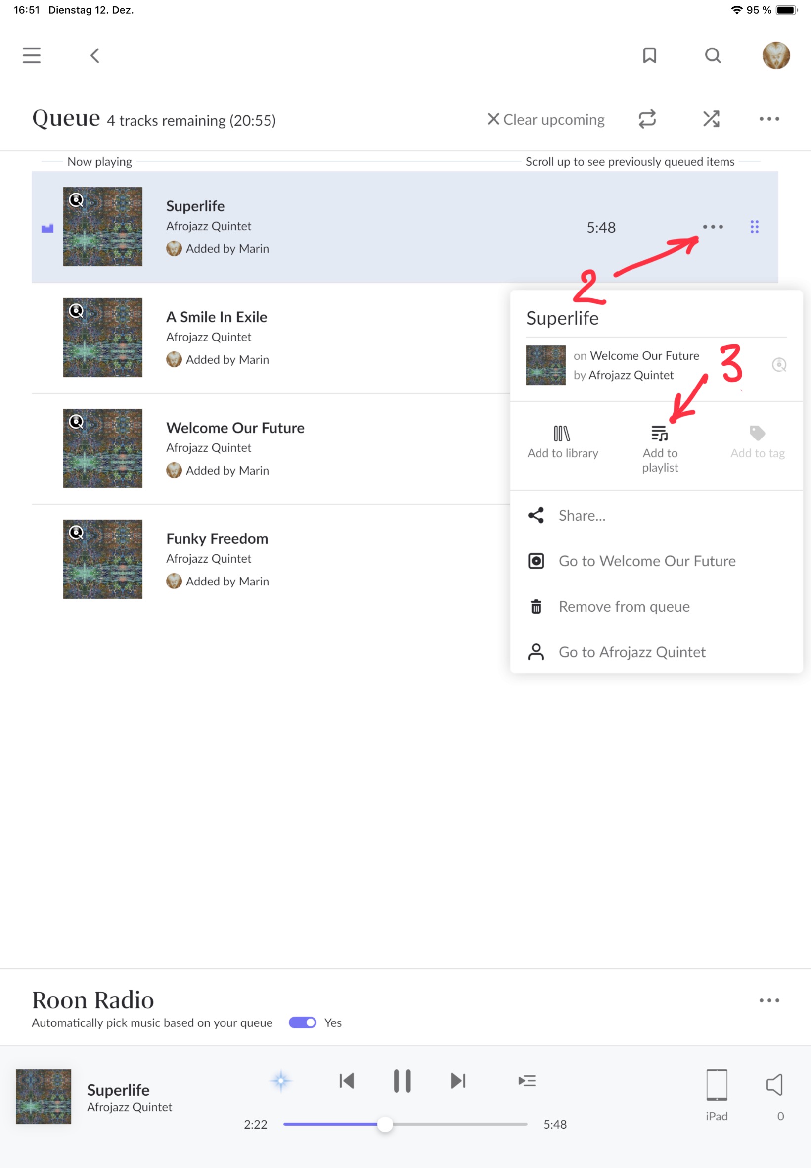 Off topic, actually, but in this use case I open the queue (1 in screenshot) with the top track being the one I’m looking for, where I’d click the three buttons (2 in screenshot) to open the pop up (3 in screenshot) and add it to any playlist in that pop up (4 in screenshot).